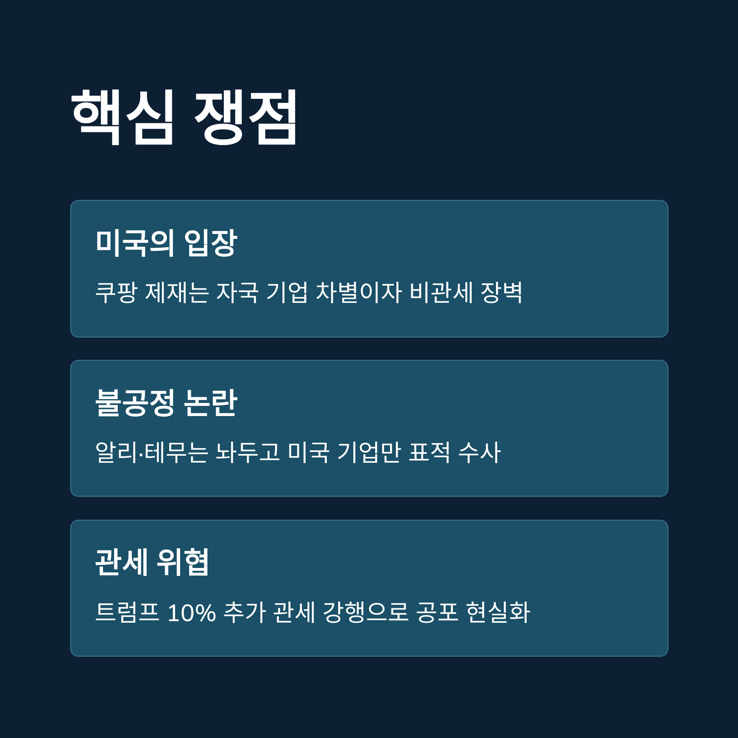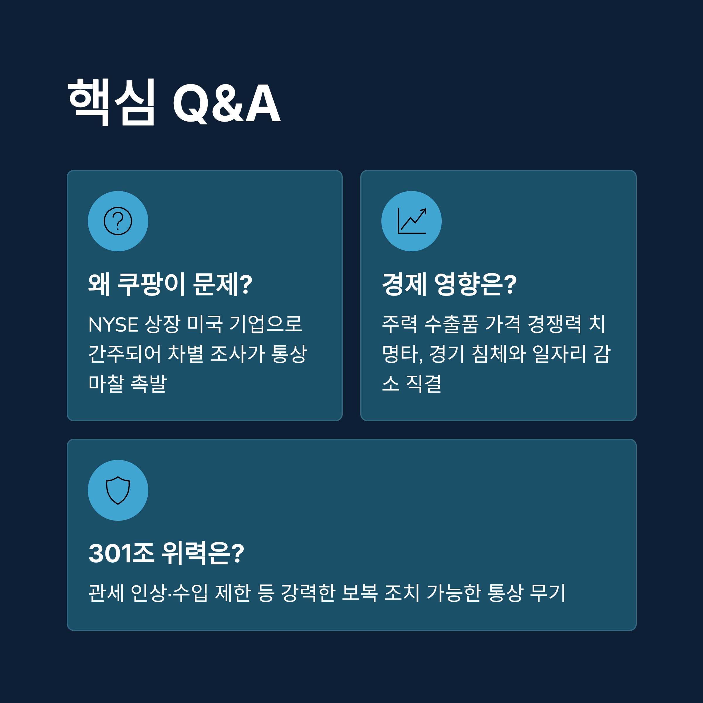 - 핵심요약: 쿠팡 차별 논란에 따른 미국의 슈퍼 301조 발동 위기와 관세 공포