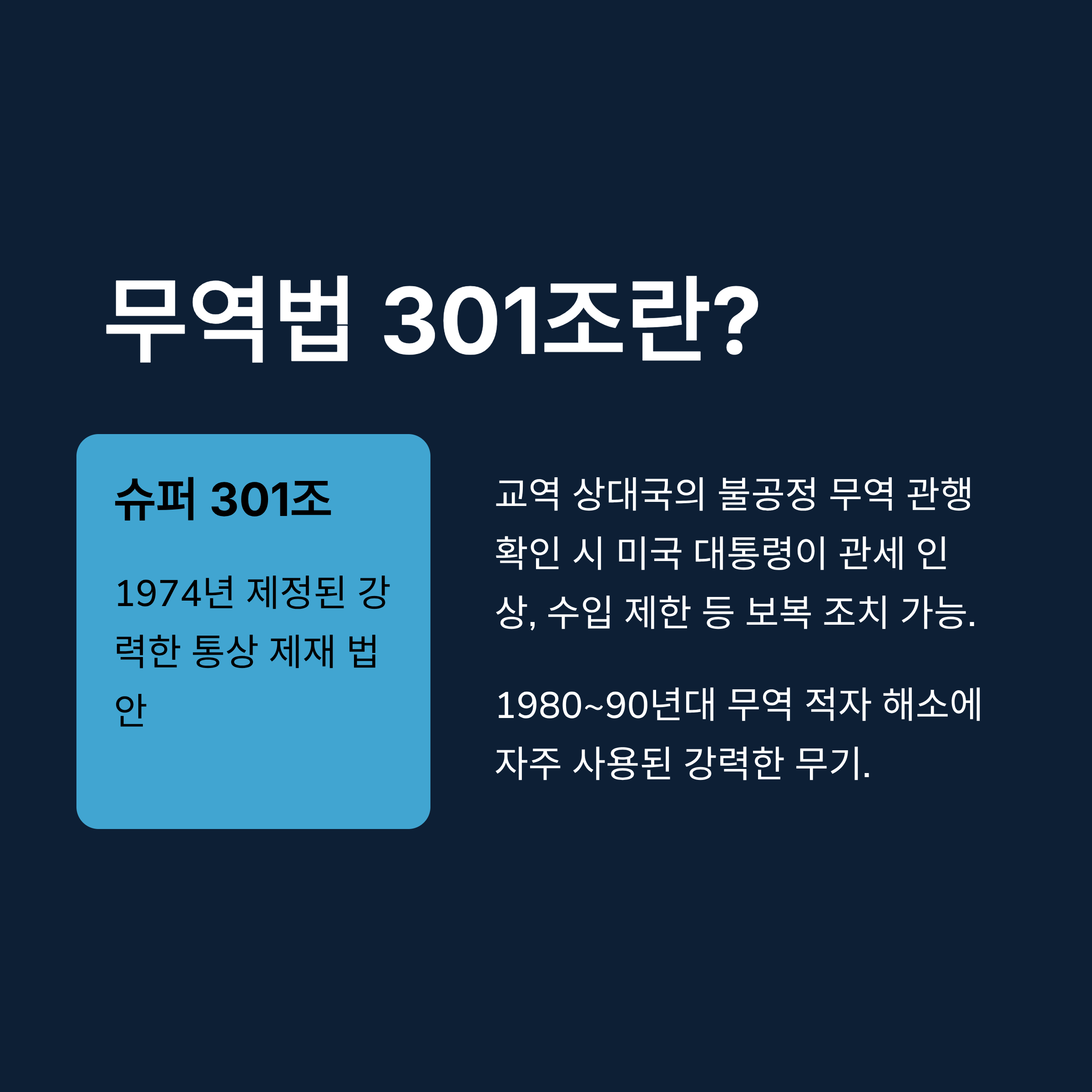 | A. 미국 무역법 301조는 교역 상대국의 불공정하거나 차별적인 무역 행위가 확인될 경우, 미국 대통령이 관세 인상이나 수입 제한 등 보복 조치를 취할 수 있도록 규정한 강력한 통상 제재 법안입니다. 과거 1980~90년대 미국이 무역 적자를 해소하기 위해 자주 사용했으며, 이번에 다시 한국을 겨냥해 거론되고 있습니다. |