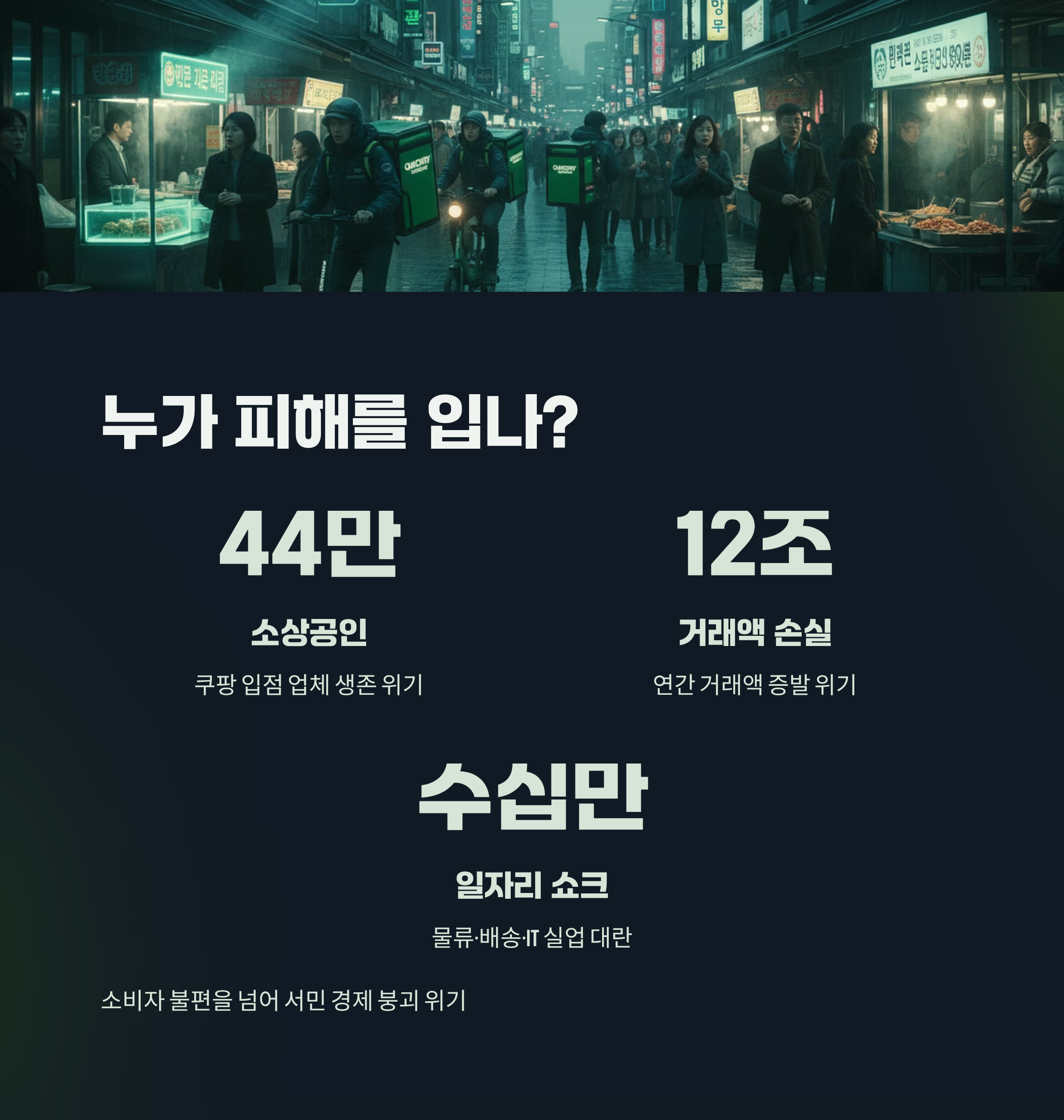 | A. 소비자의 새벽배송 중단과 같은 불편을 넘어, 쿠팡에 입점한 약 44만 소상공인들의 생계가 직접적인 위협을 받습니다. 연간 12조원에 달하는 거래액이 사라지면서 연쇄 도산 위기에 처할 수 있으며, 물류 및 배송 분야에 종사하는 수십만 명의 대규모 실업 사태가 가장 우려되는 피해입니다. |
