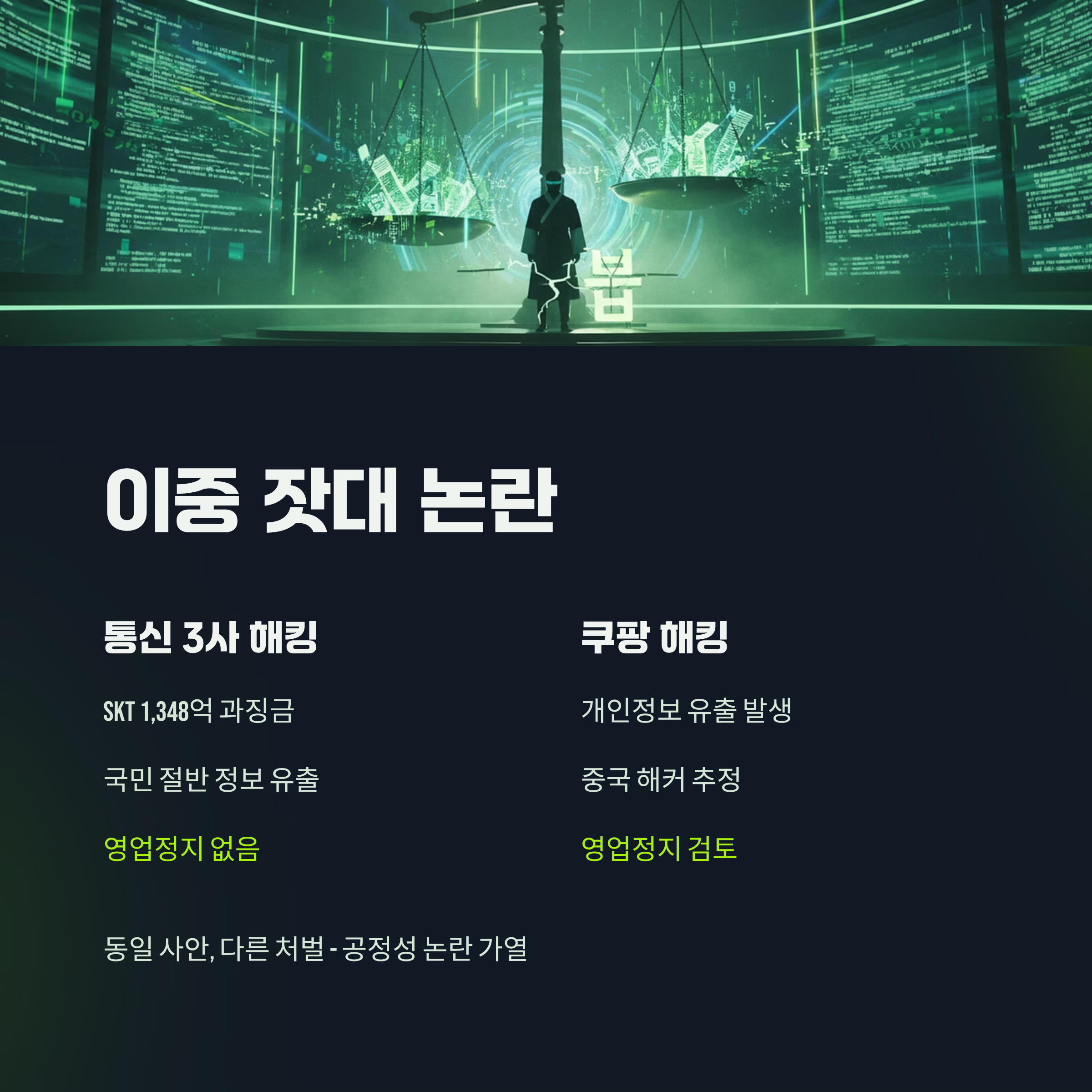 정부의 이번 조치가 비판받는 핵심 이유는 명백한 '이중 잣대' 때문입니다. 이미 올해 국민 절반의 개인정보가 유출된 SKT는 역대 최대 과징금인 1,348억 원을 부과받았고, KT와 LG유플러스 역시 중국 거대 조직이나 국가 차원의 첩보 활동으로 추정되는 해킹 피해를 입어 통신 3사가 모두 뚫린 바 있습니다. 이처럼 전 국민의 정보가 유출된 사태에서도 통신사에 대한 영업 정지 처분은 내려지지 않았습니다. "통신망 마비로 인한 산업 피해"를 이유로 들지만, 쿠팡 영업 정지로 인한 소상공인 몰락과 실업 사태는 그에 못지않은, 혹은 더 직접적인 서민 경제의 파탄을 의미합니다.