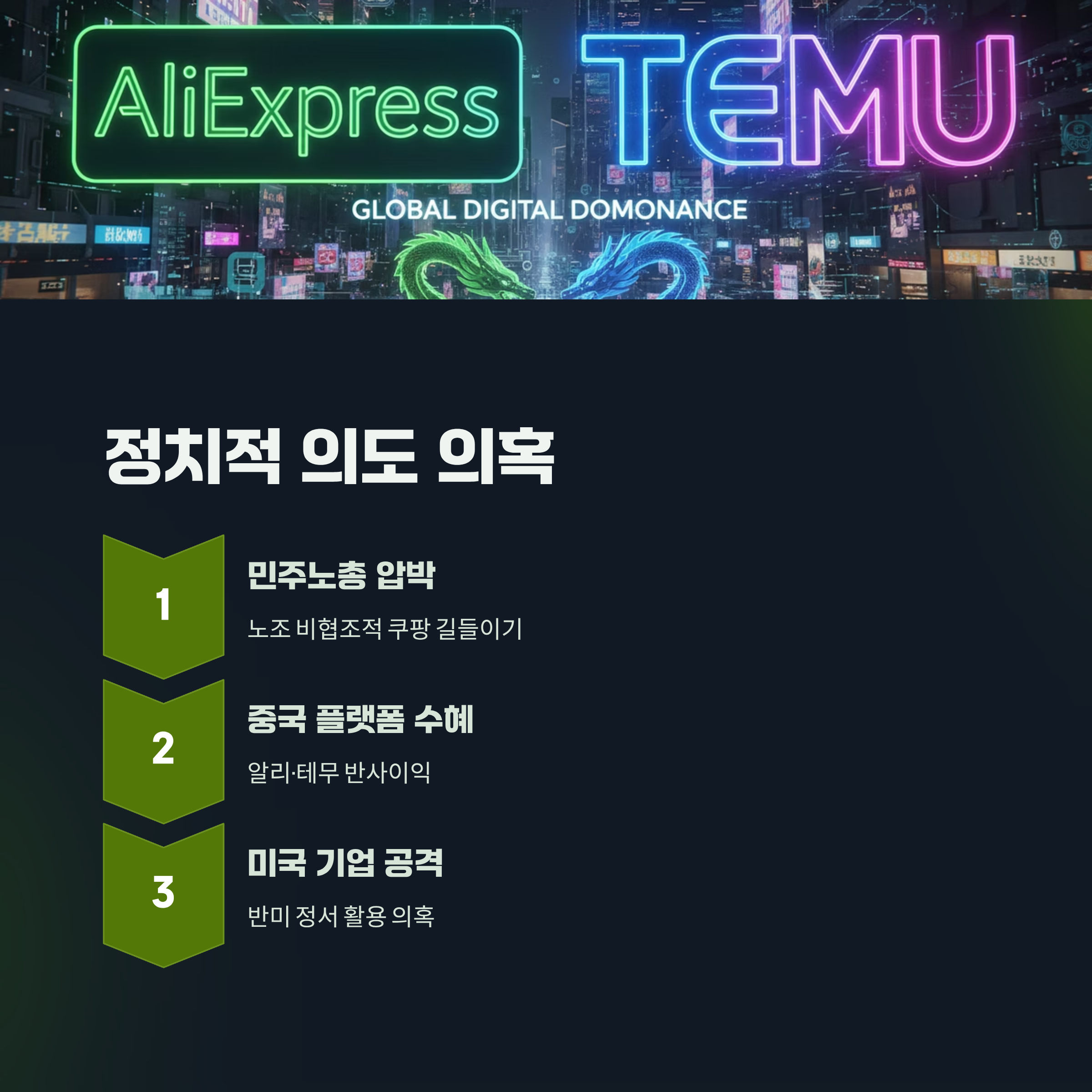 이번 사태를 단순한 보안 이슈가 아닌 정치적 맥락에서 해석하는 시각도 존재합니다. 일각에서는 현 정부(이재명 대통령 행정부)와 민주당, 그리고 민주노총이 결탁하여 '미국 기업'이자 '노조에 비타협적인' 쿠팡을 길들이기 하려는 것이 아니냐는 의혹을 제기합니다. 특히 알리익스프레스, 테무 등 중국계 이커머스 플랫폼이 국내 시장을 잠식해 들어오는 상황에서 쿠팡을 규제하는 것은 결과적으로 중국 기업에 반사이익을 안겨주는 꼴이 됩니다. 쿠팡 노조 문제와 맞물려, 정치적 목적을 위해 기업을 희생양 삼고 있다는 비판이 나오는 이유입니다.