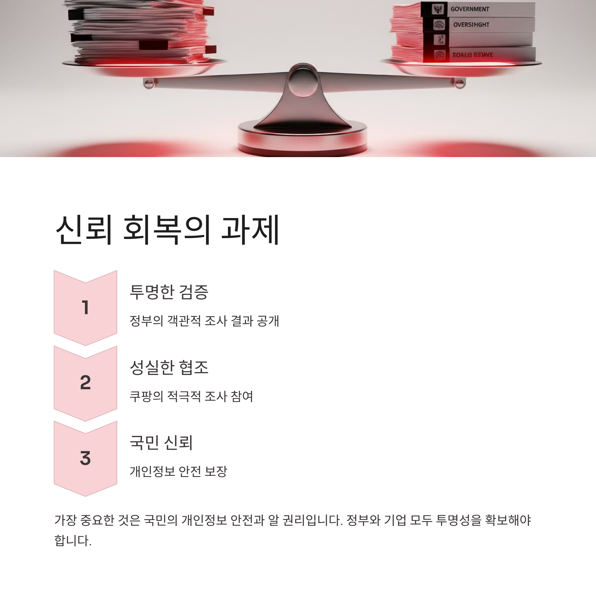 만약 쿠팡의 주장대로 피해가 3,000여 건으로 제한되고 외부 전송이 없었다면, 이는 위기 상황에서 기업이 보여준 최상의 대응으로 평가받아야 합니다. 하지만 정부의 우려처럼 섣부른 발표가 아직 확인되지 않은 사실에 기반했다면, 이는 더 큰 혼란을 야기할 수 있습니다. 가장 중요한 것은 국민의 개인정보 안전과 알 권리입니다. 정부는 특정 기업을 옥죈다는 오해를 불식시키도록 투명하고 객관적인 검증 결과를 신속히 공개해야 합니다. 쿠팡 역시 정부 조사에 끝까지 성실히 협조하여 모든 의혹을 해소해야 할 것입니다. 독자 여러분은 정부의 규제와 기업의 자율성, 그리고 국가 간 경제 전쟁의 틈바구니에서 이번 사태를 어떻게 바라보고 계십니까?