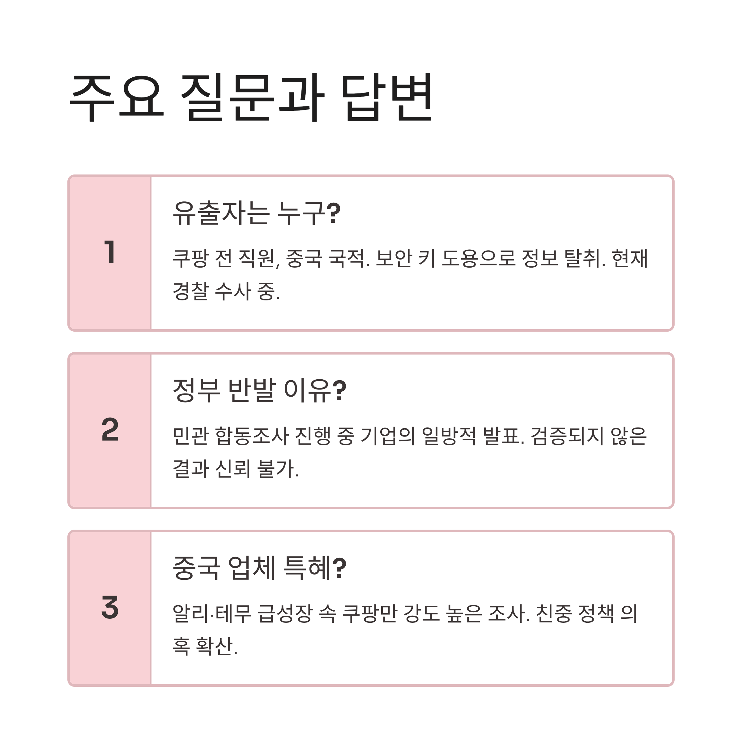 | Q3. 이번 사건과 관련해 '중국 업체 특혜' 의혹이 나오는 이유는 무엇인가요? |