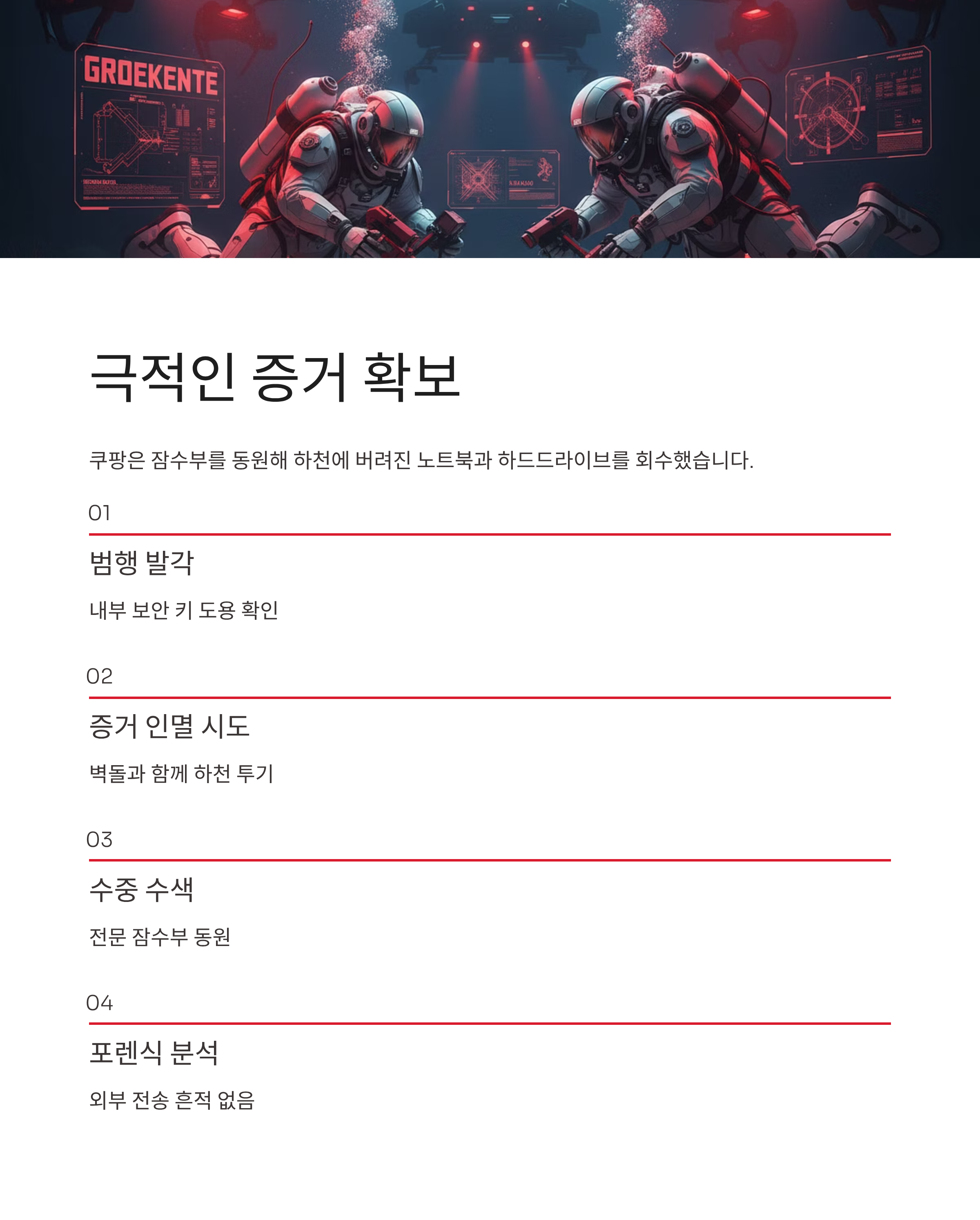 쿠팡의 발표 내용은 한 편의 첩보 영화를 방불케 합니다. 재직 중 취득한 내부 보안 키를 이용해 개인 PC로 고객 정보에 접근한 전 직원의 범행 수법부터, 범행 발각을 우려해 저장 장치를 파손하고 벽돌과 함께 하천에 투기한 증거 인멸 시도까지 매우 구체적입니다. 쿠팡이 용의자의 자백만으로 그친 것이 아니라, 직접 전문 잠수부를 동원해 수중 수색을 벌여 노트북과 하드드라이브라는 결정적 물리 증거를 확보한 점은 이번 발표의 신뢰도를 높이는 핵심 요소입니다. 회수된 기기의 일련번호와 아이클라우드 계정 정보가 일치했다는 점, 그리고 포렌식 결과 외부 전송 흔적이 없었다는 주장은 기업이 동원할 수 있는 최고 수준의 자체 조사 역량을 입증한 사례로 평가받고 있습니다.