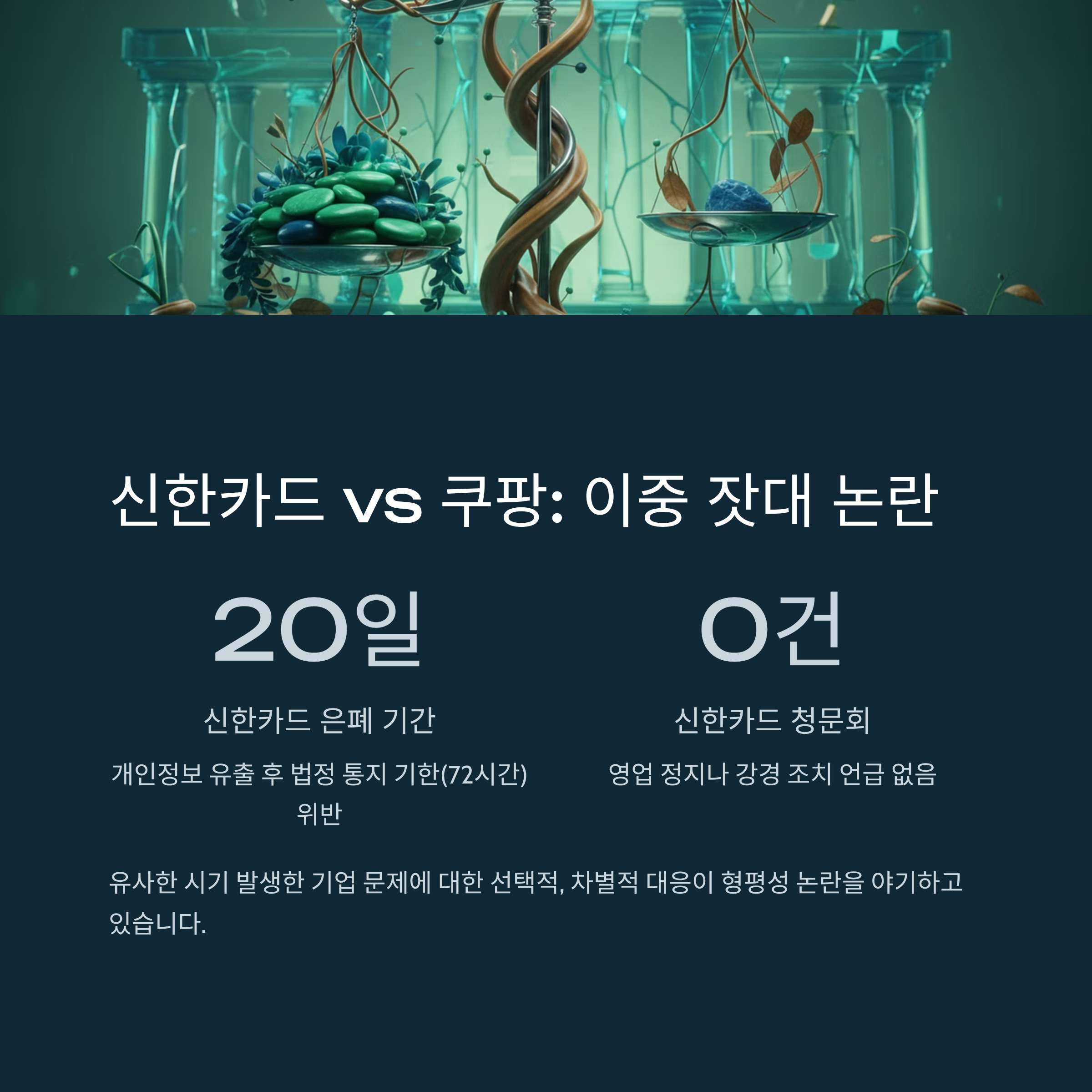 | A3. 신한카드는 개인정보 유출 후 법적 통지 기한을 넘겨 20일간 은폐했음에도 정치권의 비판 수위가 낮습니다. 반면 쿠팡에 대해서는 청문회 소환, 모욕적 질책, 영업 정지 언급 등 고강도 압박을 가하고 있어, 정부와 국회가 기업에 따라 이중 잣대를 적용한다는 비판이 제기되고 있습니다. |