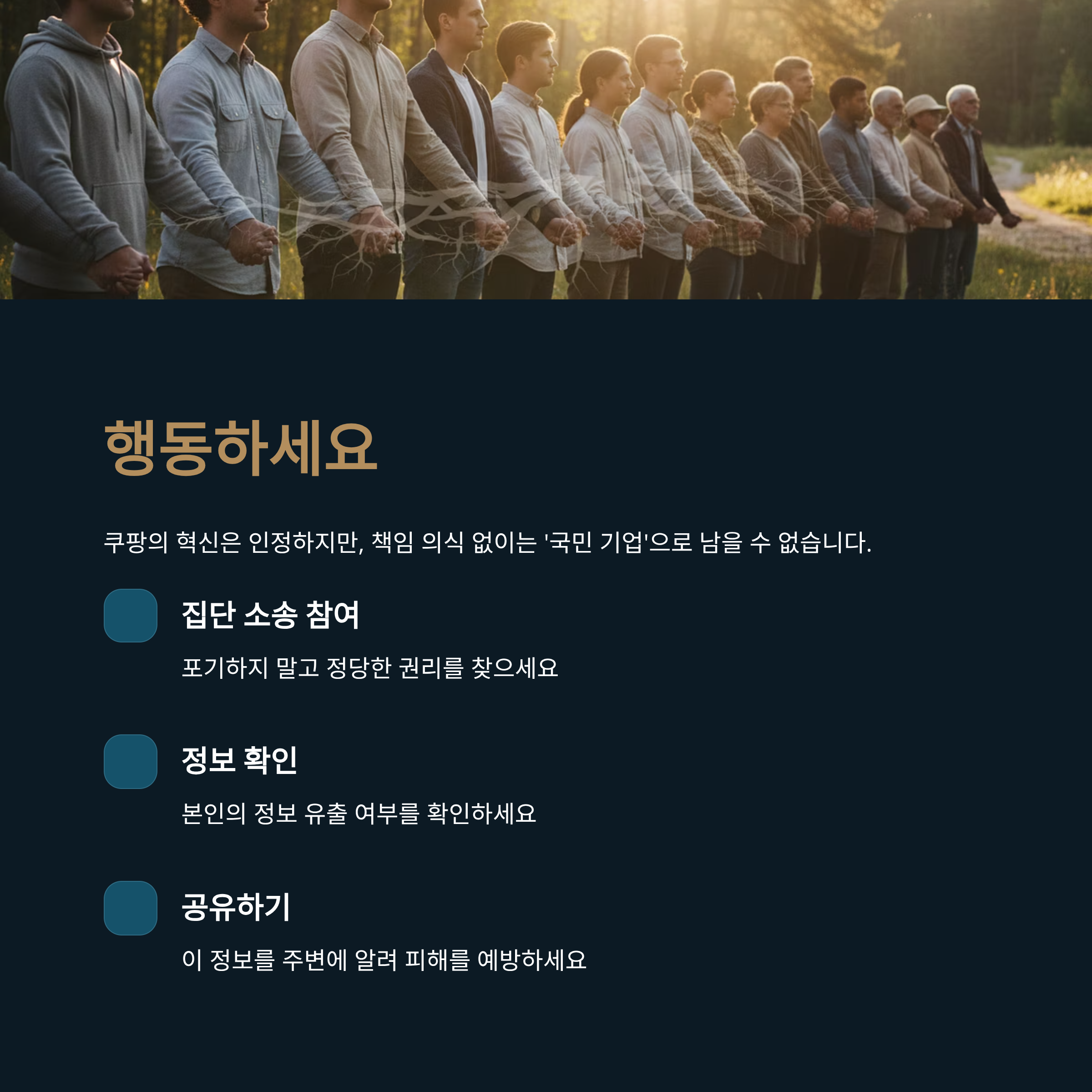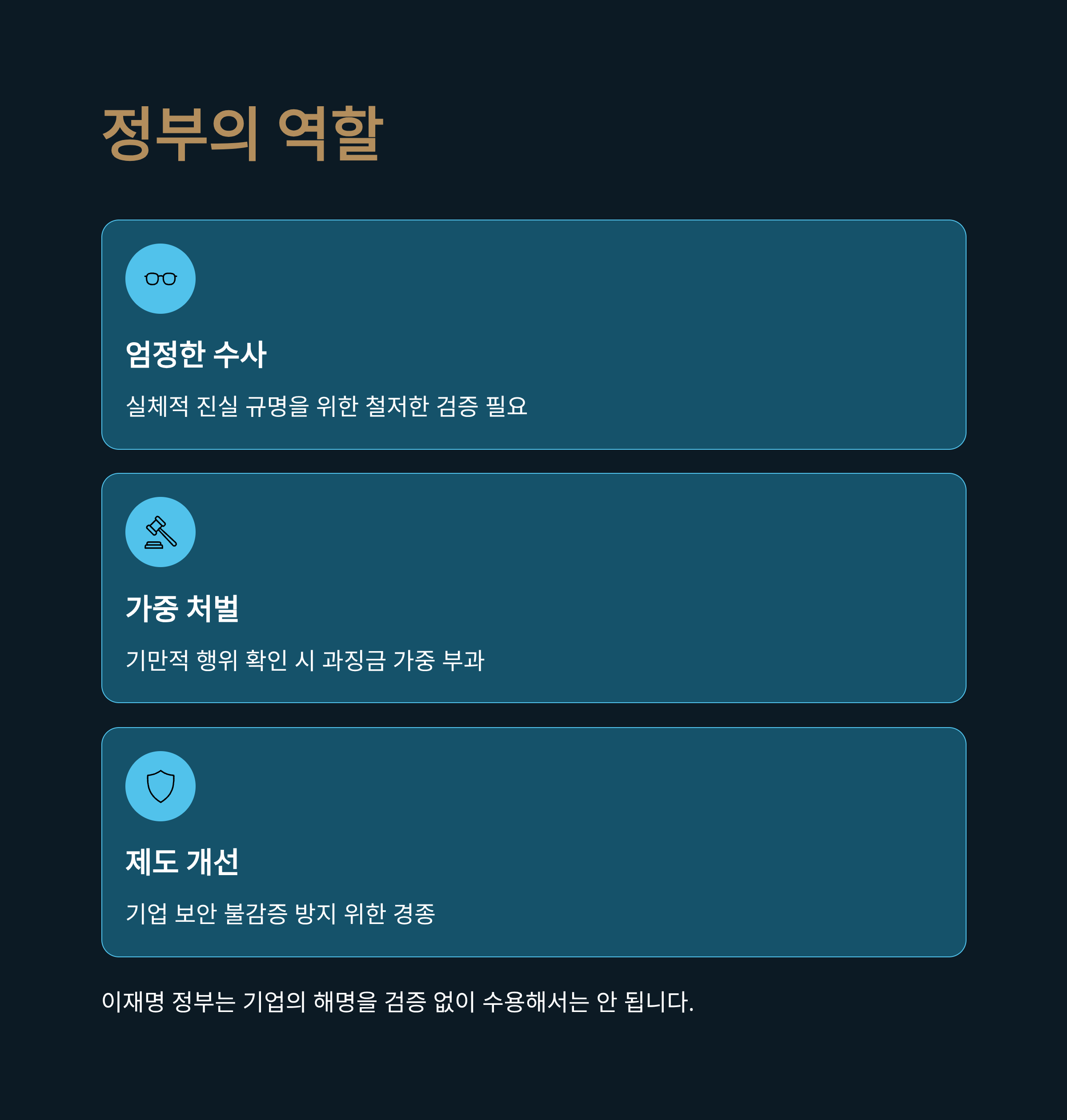 쿠팡 사태는 단순한 데이터 사고를 넘어 대한민국 플랫폼 기업의 보안 의식 수준을 적나라하게 보여주었습니다. 쿠팡이 주장하는 "강에서 건진 노트북"과 "3,000건 유출" 시나리오는 상식적으로 납득하기 어려운 부분이 많습니다. 만약 이재명 정부와 수사 기관이 이러한 기업의 해명을 철저한 검증 없이 수용한다면, 현재 진행 중인 50만 명 규모의 집단 소송은 무력화될 것이며 피해자들은 아무런 보상을 받지 못하게 될 것입니다. 이는 향후 기업들이 개인정보 유출 사고를 낼 때마다 증거를 인멸하고 축소 발표를 하게 만드는 나쁜 선례가 될 수 있습니다.
