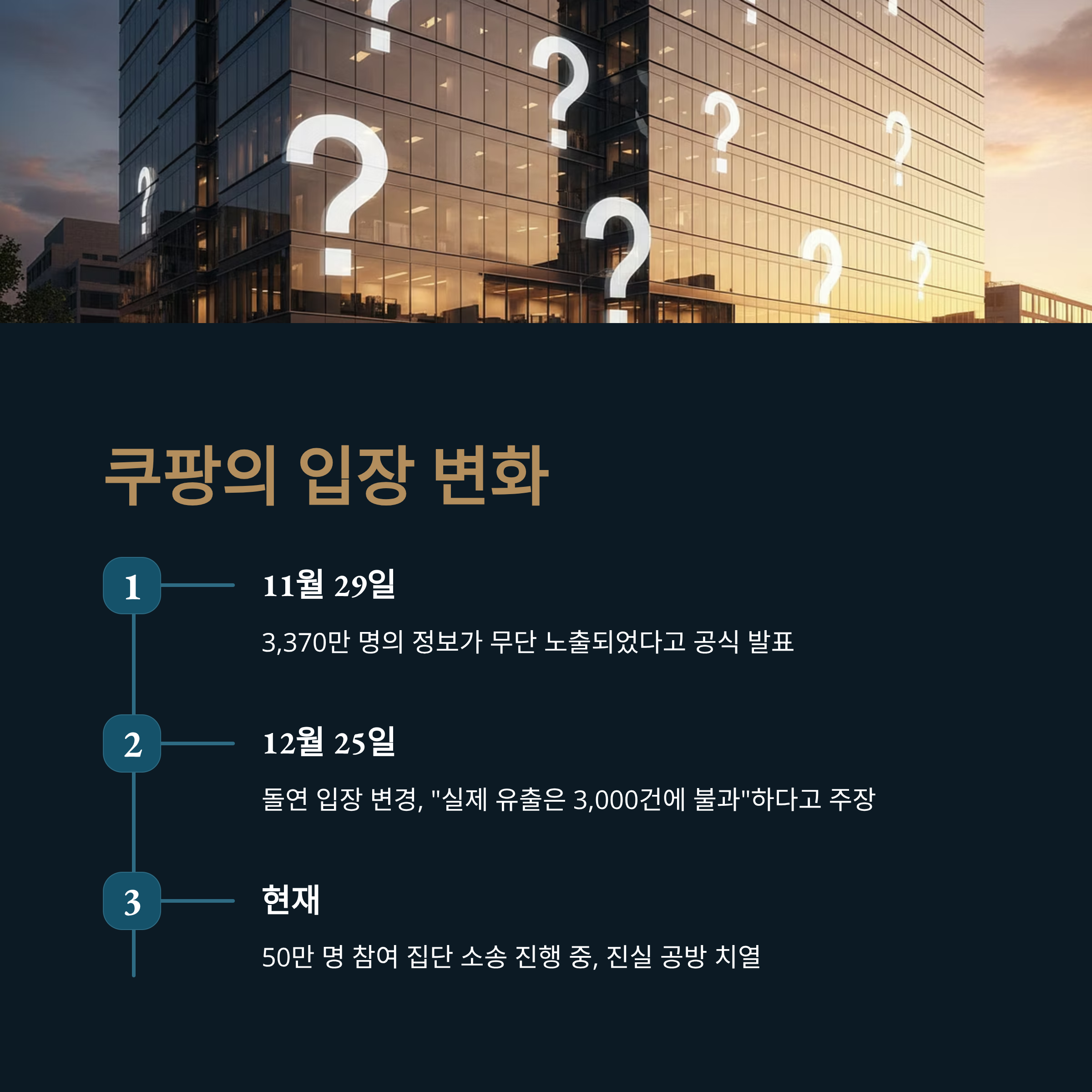 문제는 사건 발생 이후 쿠팡의 태도입니다. 초기에는 대규모 유출을 인정하는 듯했으나, 크리스마스인 12월 25일 돌연 입장을 바꿔 "실제 유출은 3,000건에 불과하다"는 주장을 내놓았습니다. 이는 피해자들에게 큰 혼란을 주고 있으며, 현재 50만 명이 참여한 집단 소송의 향방을 가를 중요한 쟁점이 되고 있습니다. 과연 쿠팡의 해명은 진실일까요, 아니면 과징금을 줄이기 위한 꼼수일까요? 본고에서는 이번 사태의 전말과 쿠팡 측 주장의 허점을 면밀히 분석하고 대응 방안을 모색합니다.