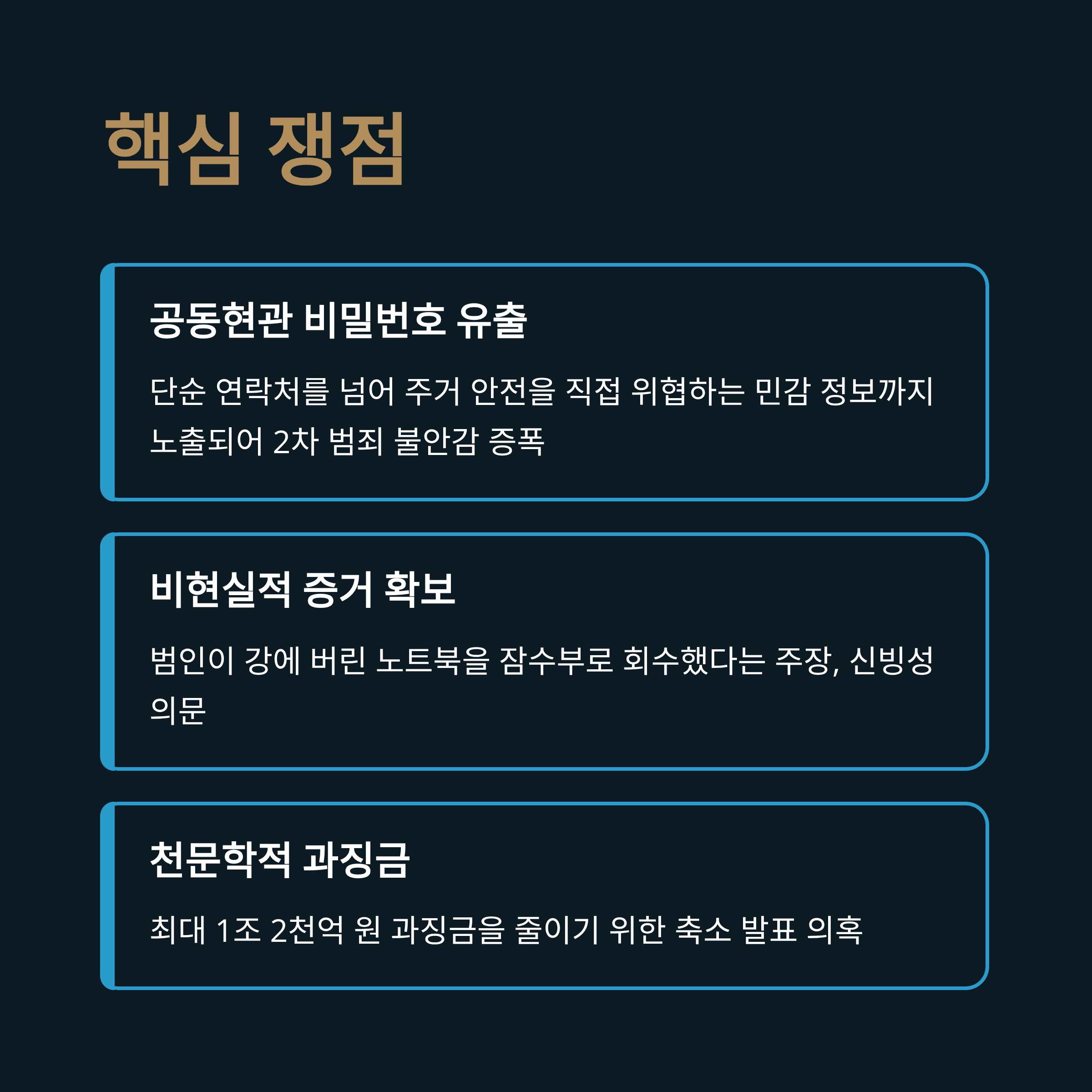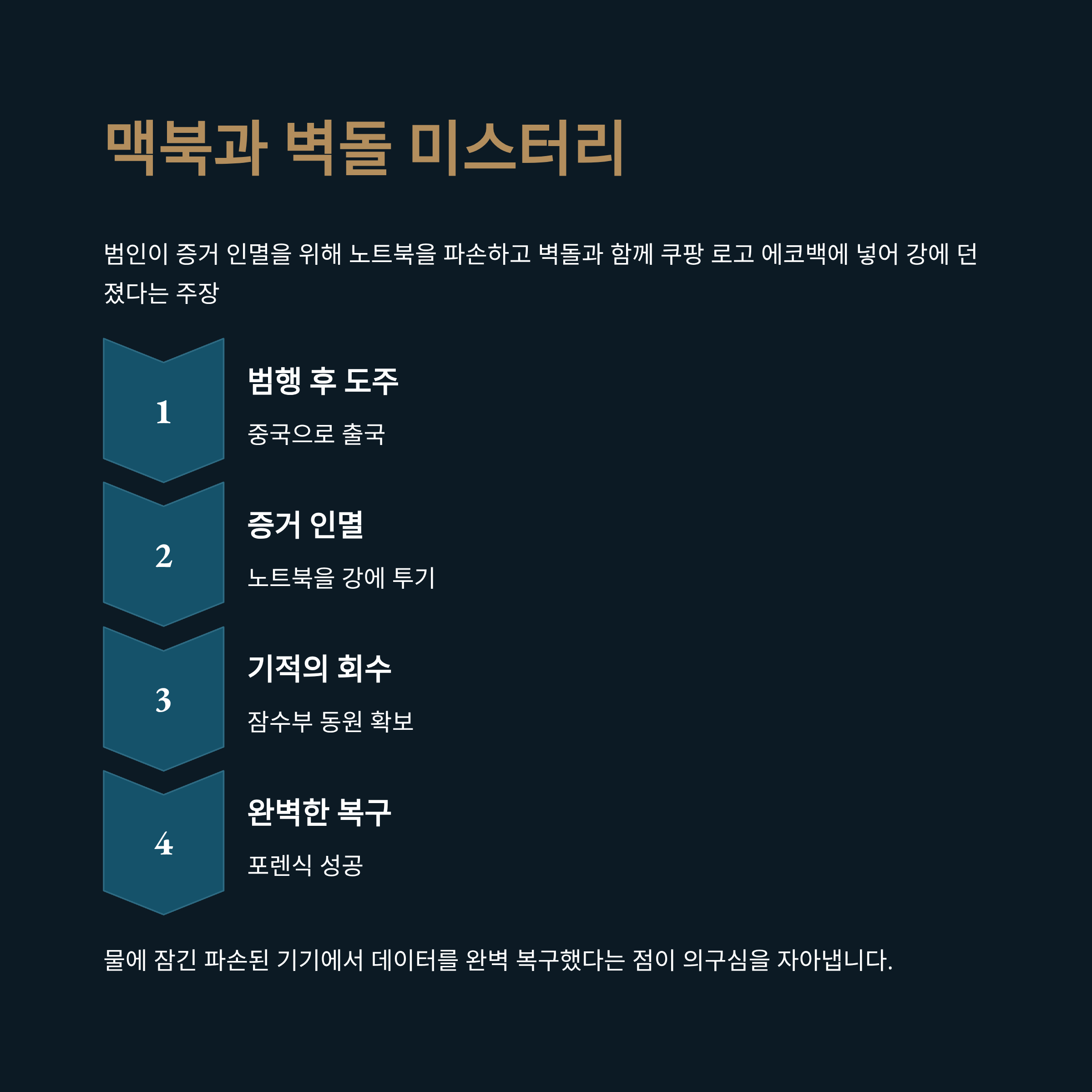 비현실적 증거 확보: 범인이 중국으로 도주한 뒤 강에 버렸다는 노트북을 쿠팡이 잠수부를 동원해 회수했다는 주장은 신빙성에 대한 의문을 낳고 있으며, 사건 축소 및 은폐 의혹의 핵심 근거가 되고 있습니다.
