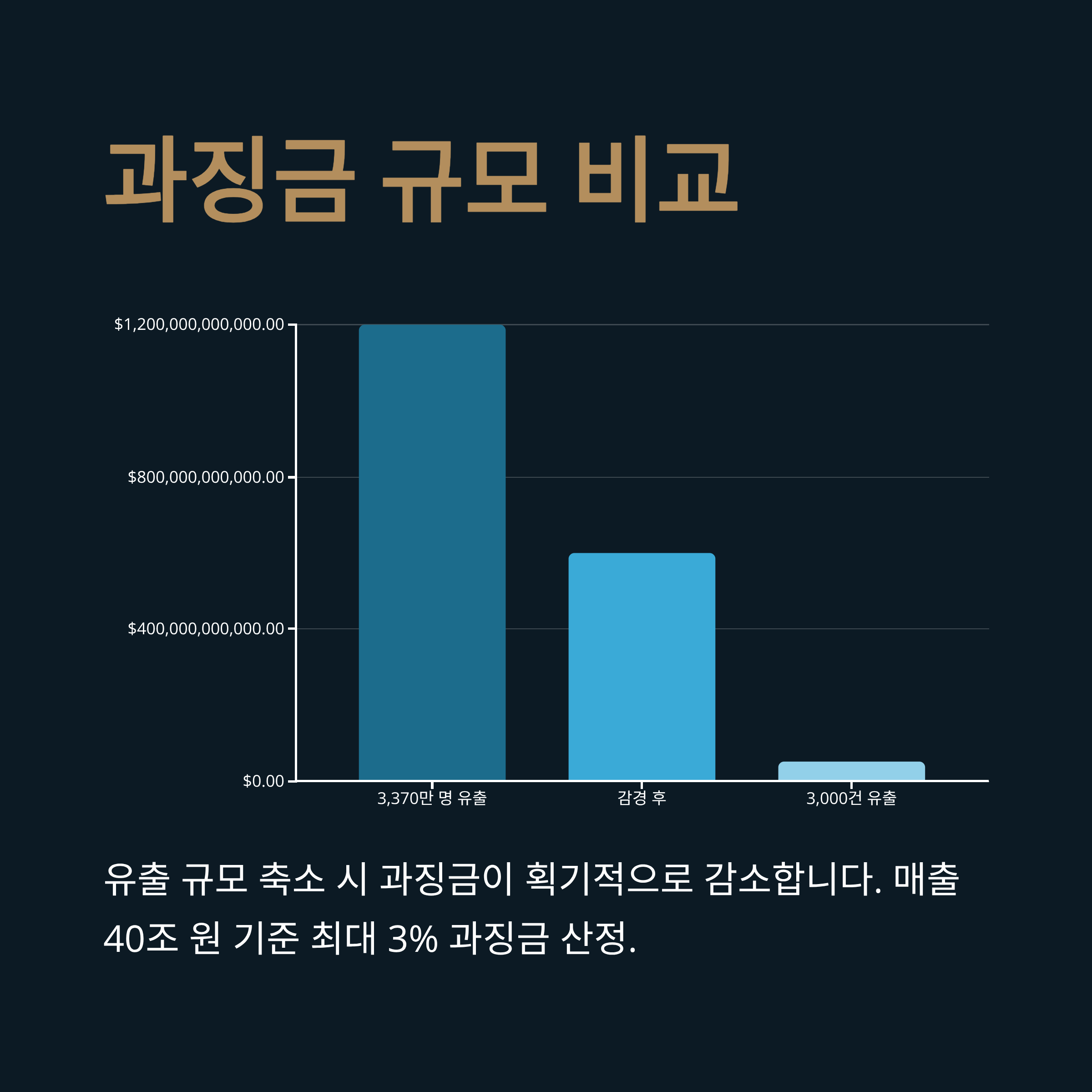 천문학적 과징금: 현행법에 따라 최대 1조 2천억 원에 이를 수 있는 과징금 규모를 줄이기 위해, 쿠팡이 유출 건수를 3,370만 건에서 3,000건으로 축소 발표한 것이 아니냐는 비판이 제기되고 있습니다.