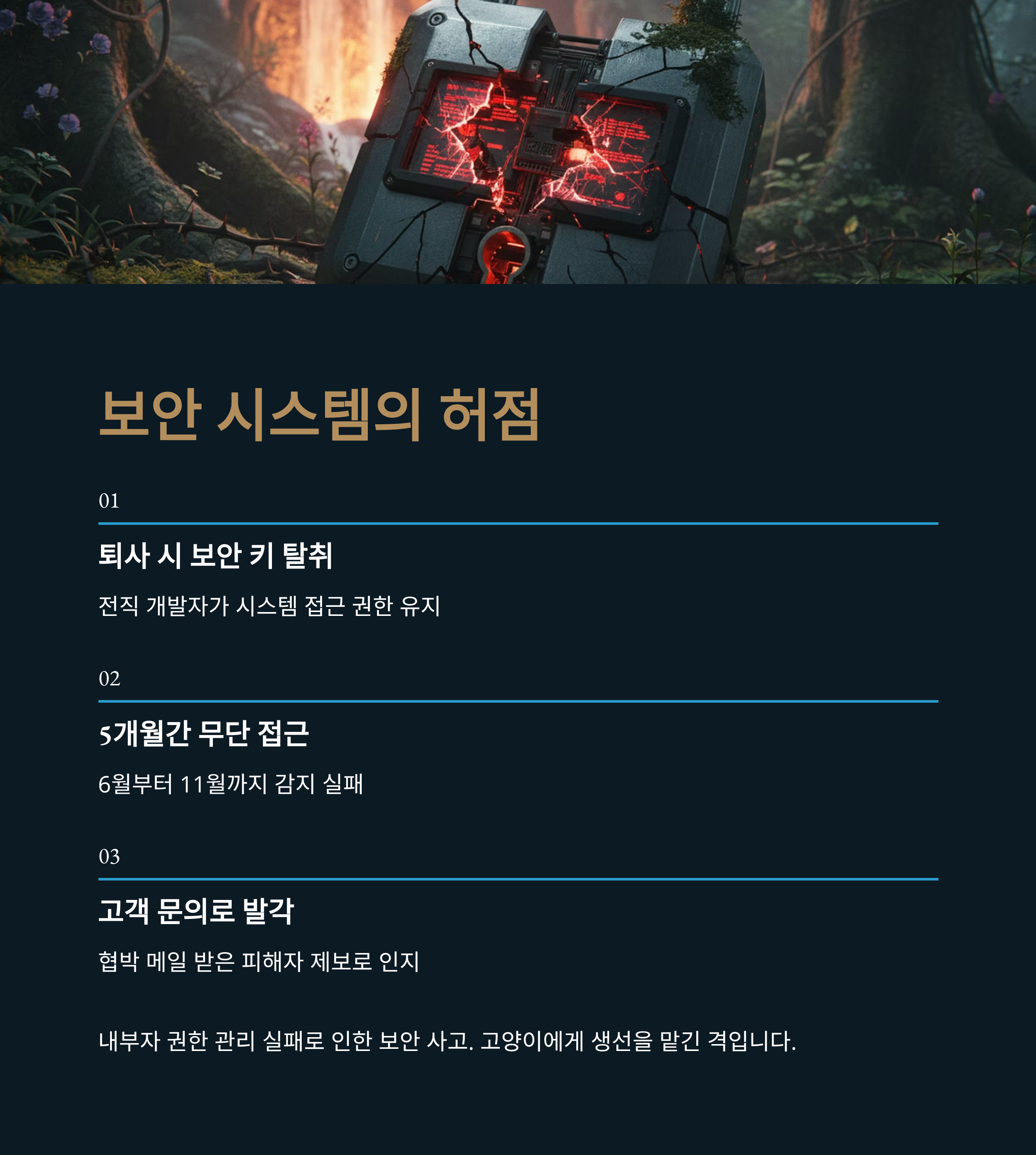 이번 사건의 핵심은 외부 해킹이 아니라 내부 직원에 의한 유출이라는 점입니다. 중국 국적의 전직 시스템 개발자가 퇴사 과정에서 보안 키(Security Key)를 탈취해 5개월간이나 접근 권한을 유지했다는 사실은 쿠팡의 보안 시스템이 얼마나 허술했는지를 방증합니다. 6월부터 유출이 시작되었음에도 11월에야 협박 메일을 받은 고객들의 문의로 사태를 인지했다는 점은 변명의 여지가 없는 관리 소홀입니다.