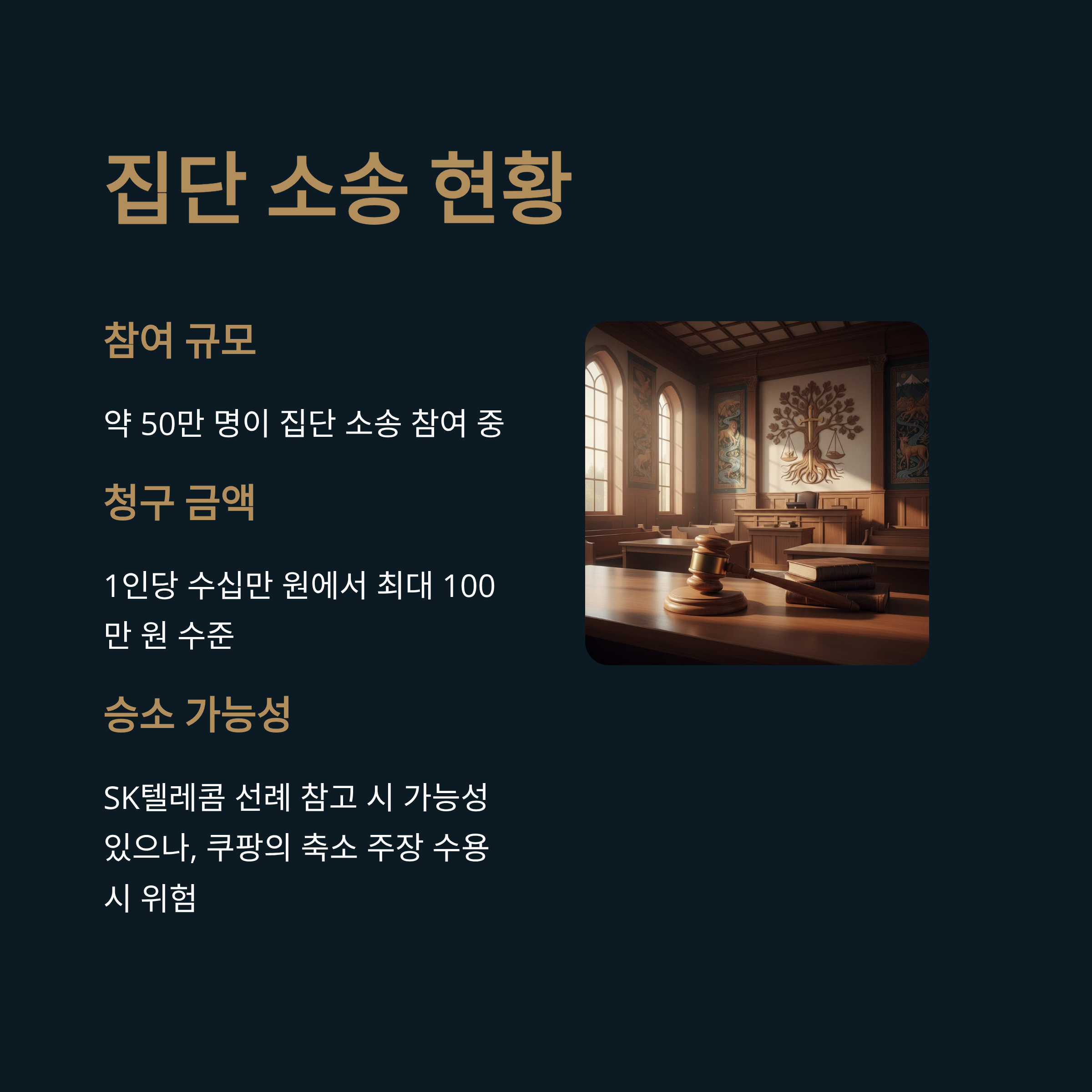 | A3. 현재 약 50만 명이 집단 소송에 참여 중이며, 승소 시 1인당 수십만 원에서 최대 100만 원 수준의 손해배상을 청구하고 있습니다. 과거 SK텔레콤 사례 등을 볼 때 승소 가능성은 있으나, 쿠팡의 '3,000건 유출' 주장이 받아들여질 경우 소송이 기각되거나 배상액이 미미해질 위험도 있습니다. |