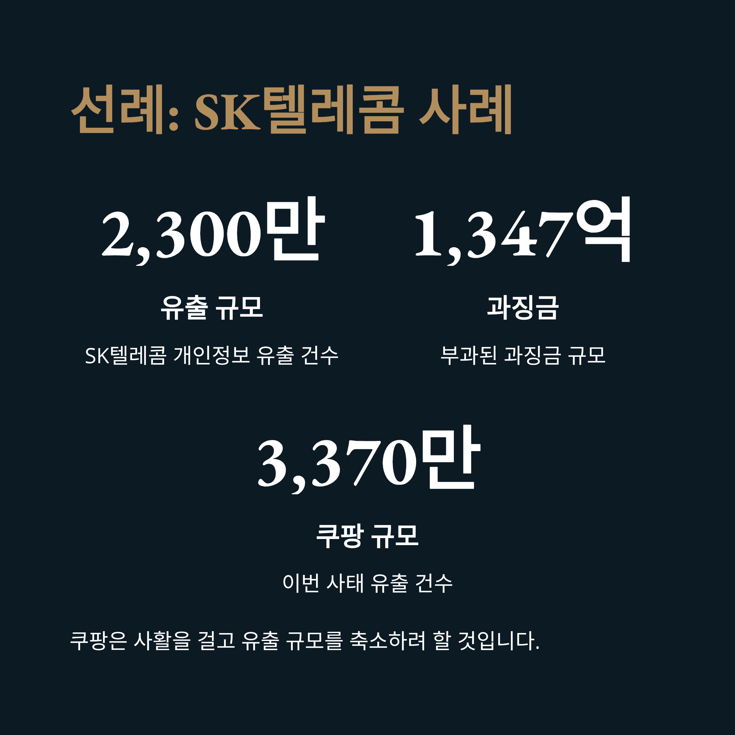 2023~2025년 평균 매출을 약 40조 원으로 추산할 때, 최대 과징금은 매출의 3%인 1조 2천억 원에 달할 수 있습니다. ISMSP 인증 등을 통한 50% 감경을 고려해도 수천억 원대입니다. 만약 유출 규모가 3,300만 명이 아닌 3,000명으로 인정된다면, 과징금 규모는 획기적으로 줄어들고 진행 중인 집단 소송 또한 기각될 가능성이 커집니다. SK텔레콤이 2,300만 명 유출로 1,347억 원의 과징금을 맞았던 선례를 볼 때, 쿠팡은 사활을 걸고 유출 규모를 축소하려 할 것입니다.