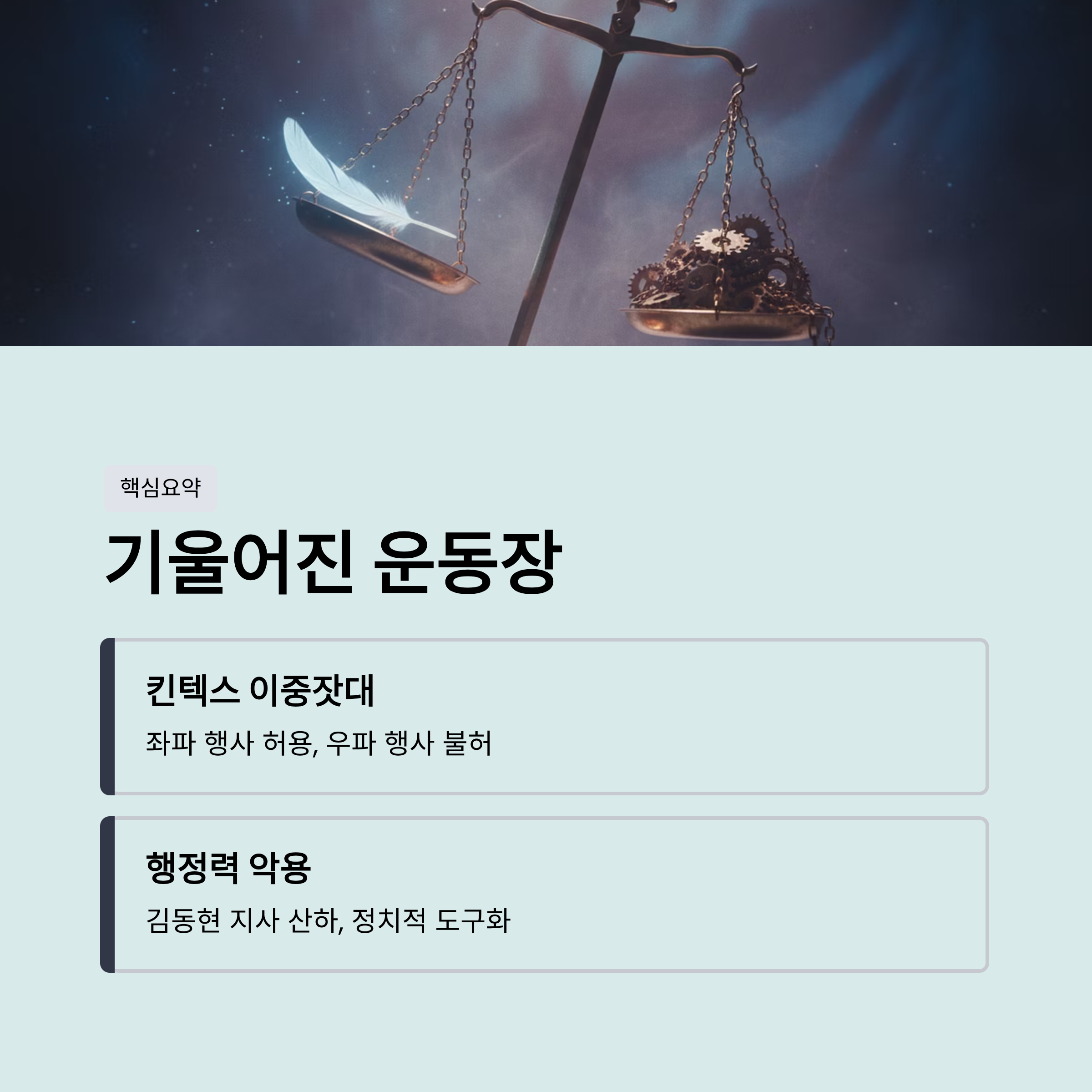 기울어진 운동장: 김동현 경기도 지사 산하의 일산 킨텍스는 김어준 등의 좌파 행사는 허용하면서도, 전 대표 측의 대관은 '사회 통념'을 이유로 불허했습니다. 이는 행정력이 정치적 도구로 악용되고 있음을 시사합니다.