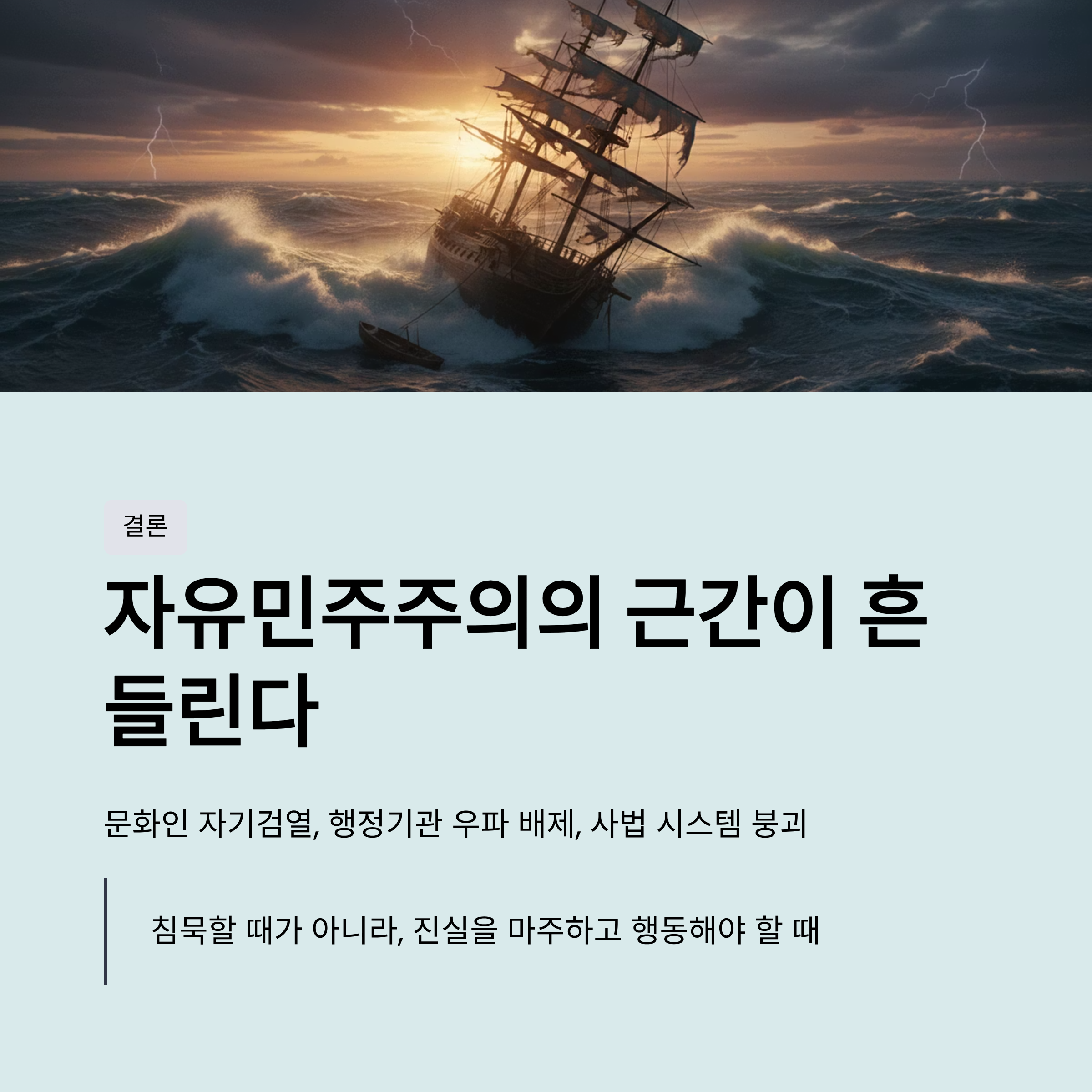 체제 위기: 윤석열 전 대통령에게 내란죄 혐의로 무기징역이 선고되고, 법 왜곡죄가 통과되어 사법부가 장악된 상황에서도 국민적 저항이 미비한 점은 대한민국이 심각한 전체주의적 위기에 처해있음을 보여줍니다.
