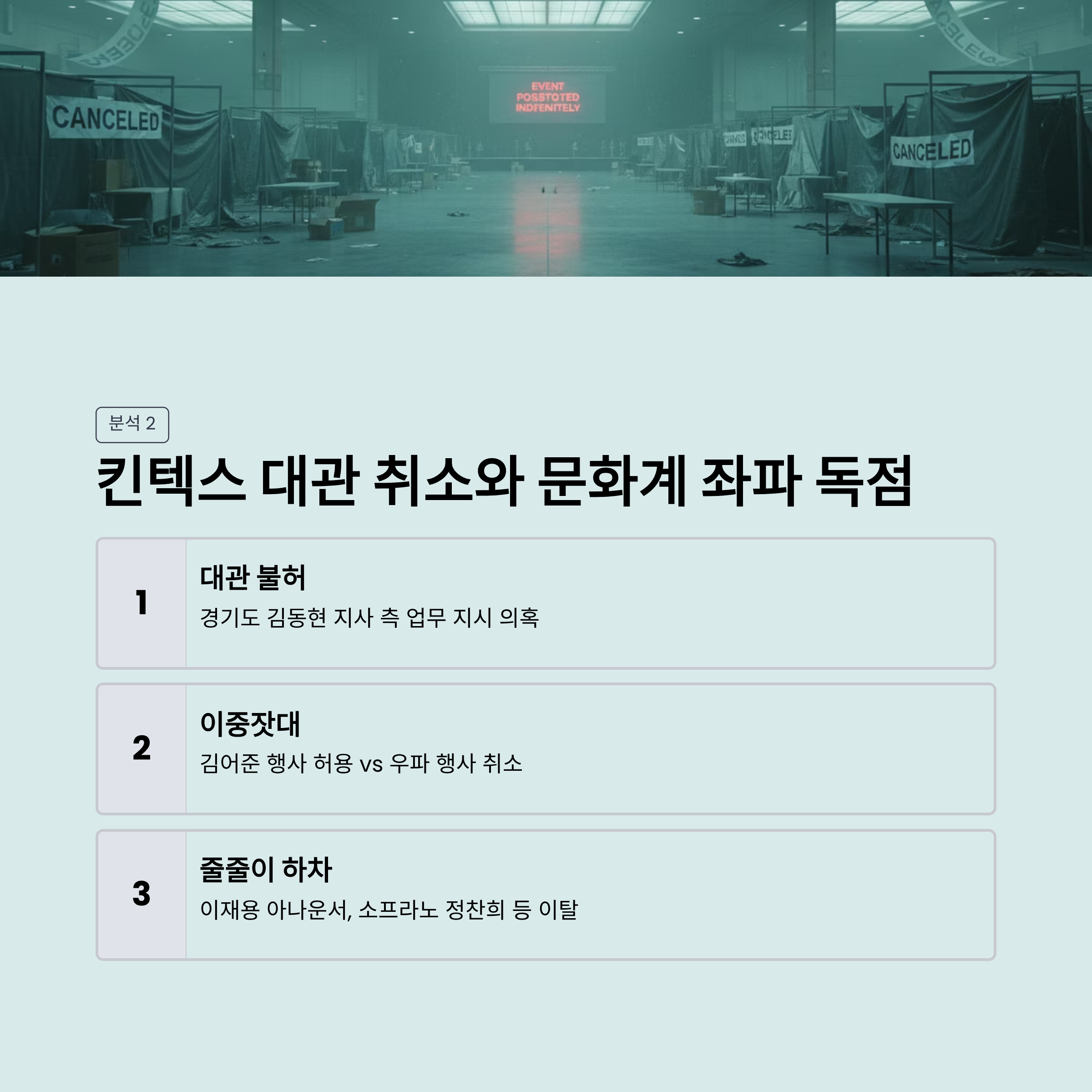| A2. 출연진들의 하차도 있었지만, 핵심은 김동현 경기도 지사의 영향력 아래 있는 킨텍스 측의 대관 불허입니다. 좌파 성향 행사는 허용하면서 우파 행사는 막는 이중적 행정 처리가 주된 원인입니다. |