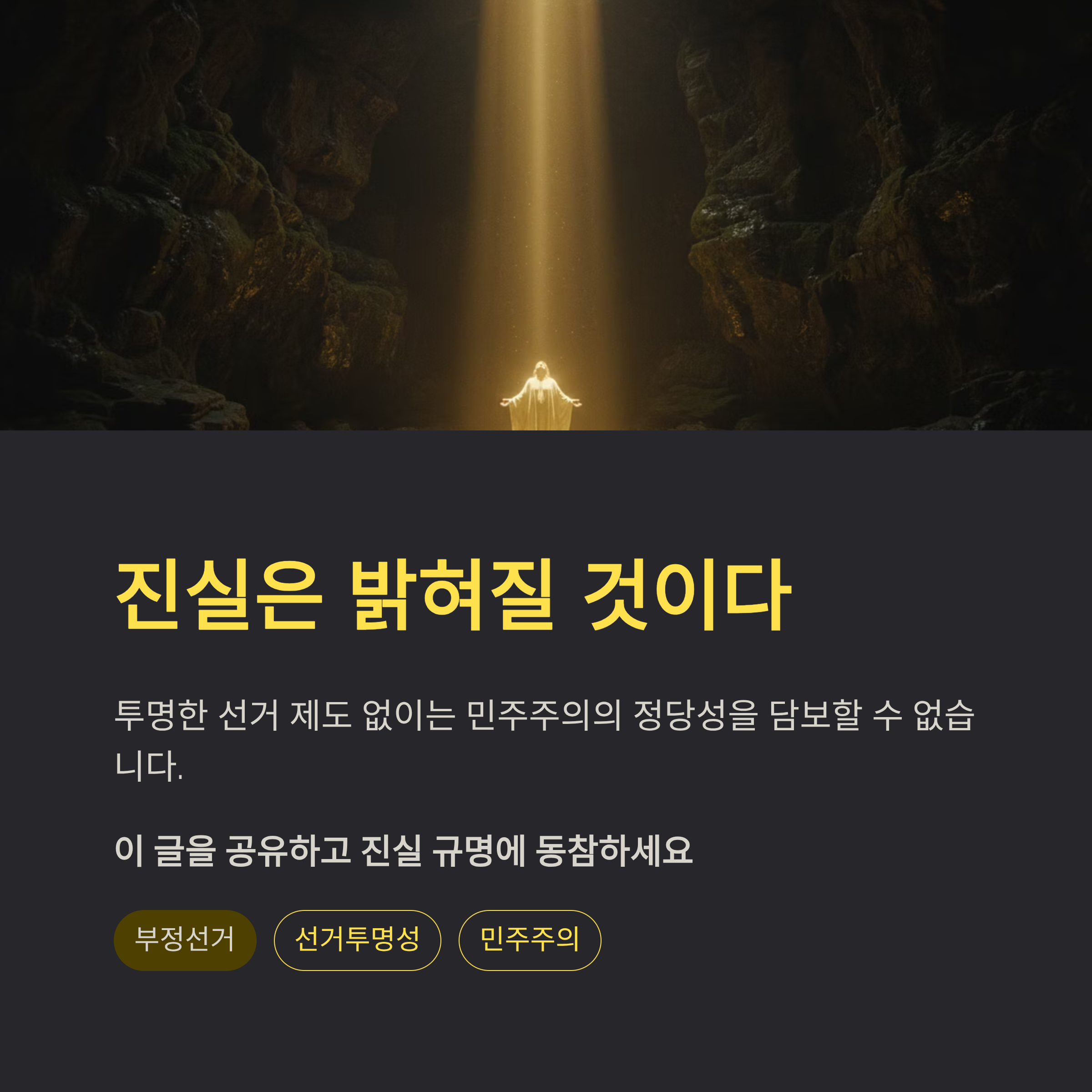 특히 한국의 선거 시스템이 국제적인 부정선거 의혹의 중심에 있다는 주장은 국가의 신뢰도와 직결된 문제입니다. 언론과 정치권은 침묵으로 일관할 것이 아니라, 제기된 의혹에 대해 명확한 사실관계를 규명하고 국민적 의구심을 해소해야 합니다. 선거 과정 전반을 투명하게 공개하고, 수개표 등 검증 가능한 절차를 강화하는 제도적 보완이 시급합니다. 투명한 선거 제도의 확립 없이는 민주주의의 정당성을 담보할 수 없음을 명심해야 할 것입니다.