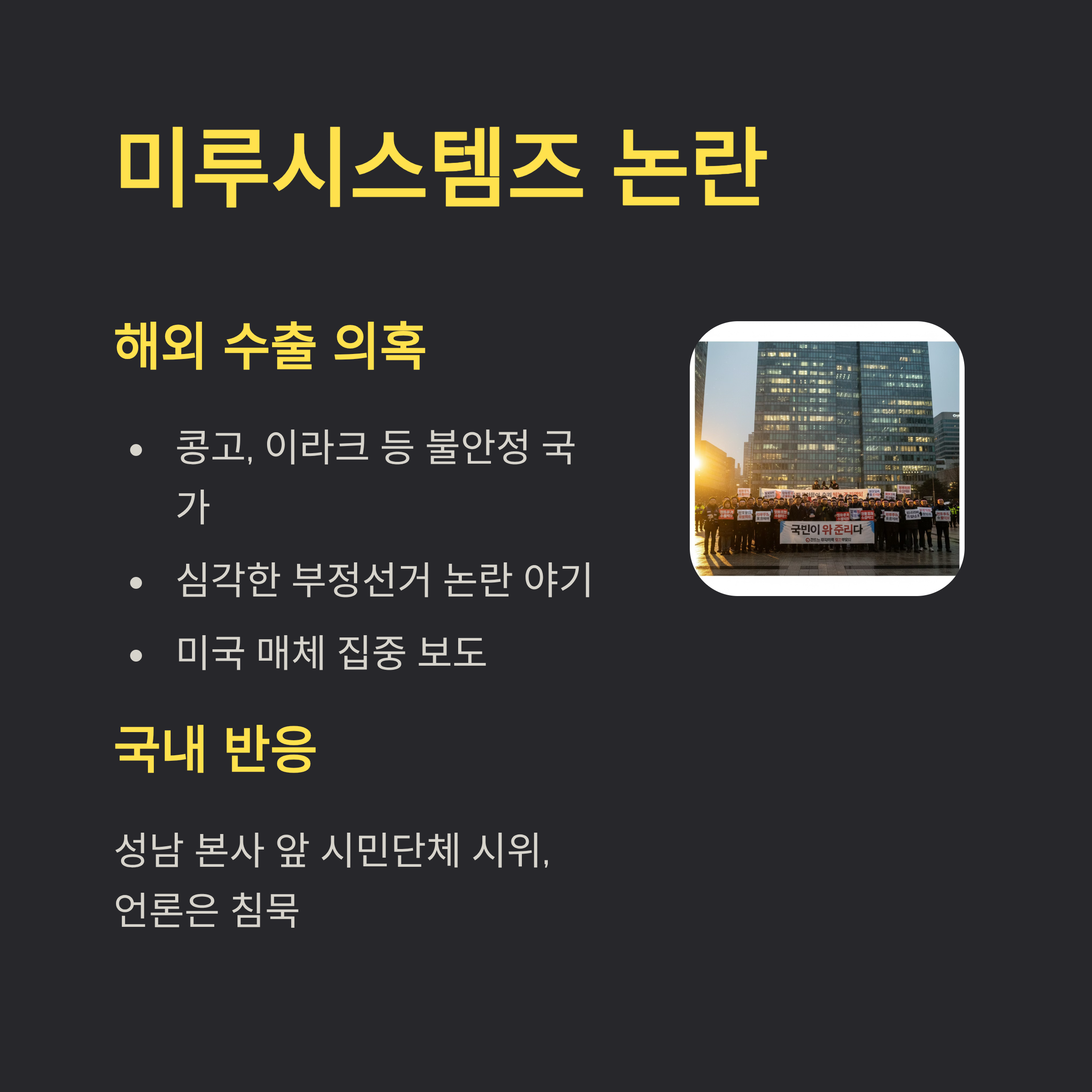 | A-WEB / 미루시스템즈 | 콩고, 이라크 등 해외 부정선거 개입 의혹, 시민단체의 항의 시위 및 FBI 수사 가능성 제기 |