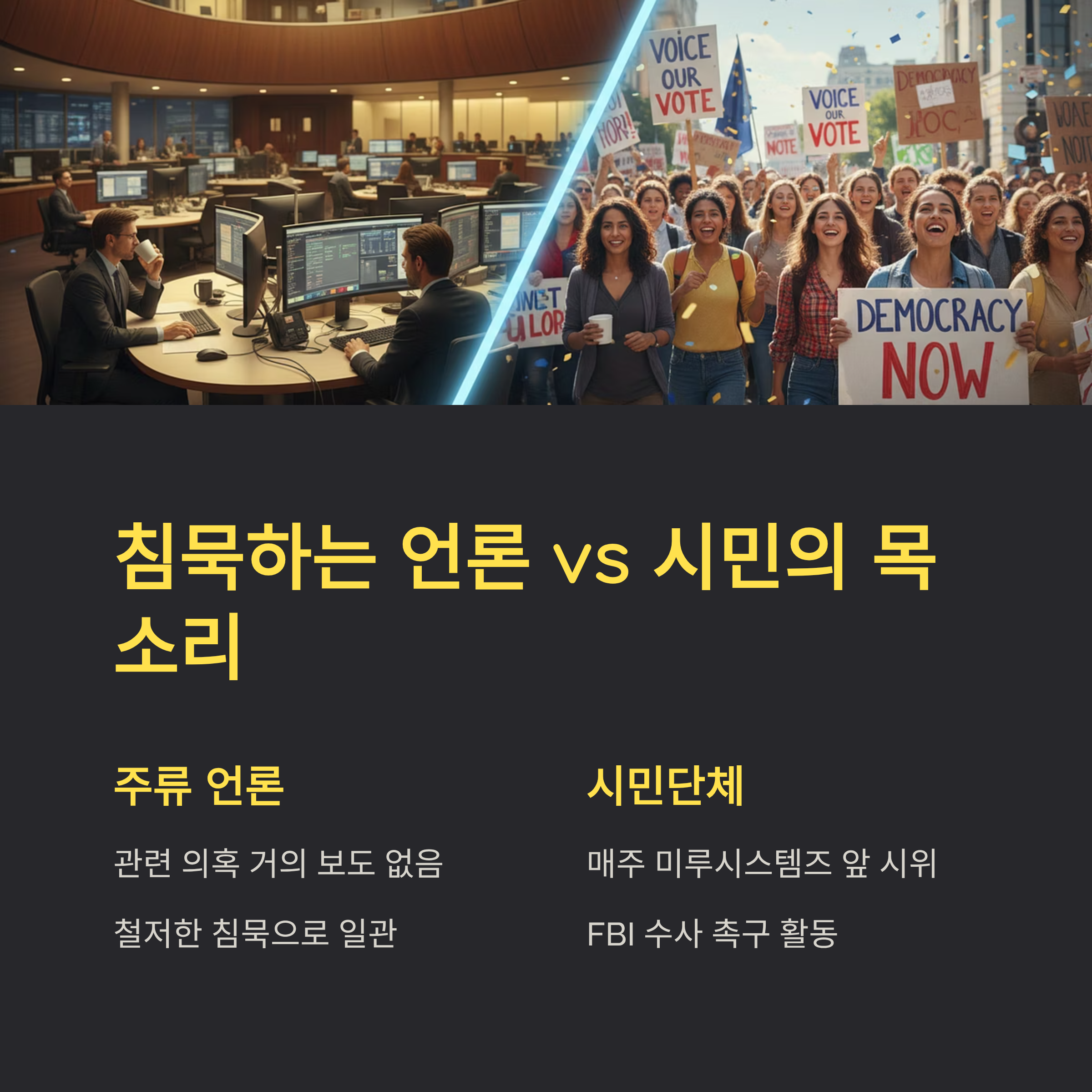 | A. 국내 주류 언론은 관련 의혹에 대해 거의 보도하지 않고 침묵하고 있으나, 일부 시민단체는 성남 미루시스템즈 본사 앞에서 FBI 수사 촉구 시위를 벌이고 있습니다. 이들은 한국 시스템의 실체를 밝히기 위한 활동을 지속하고 있습니다. |