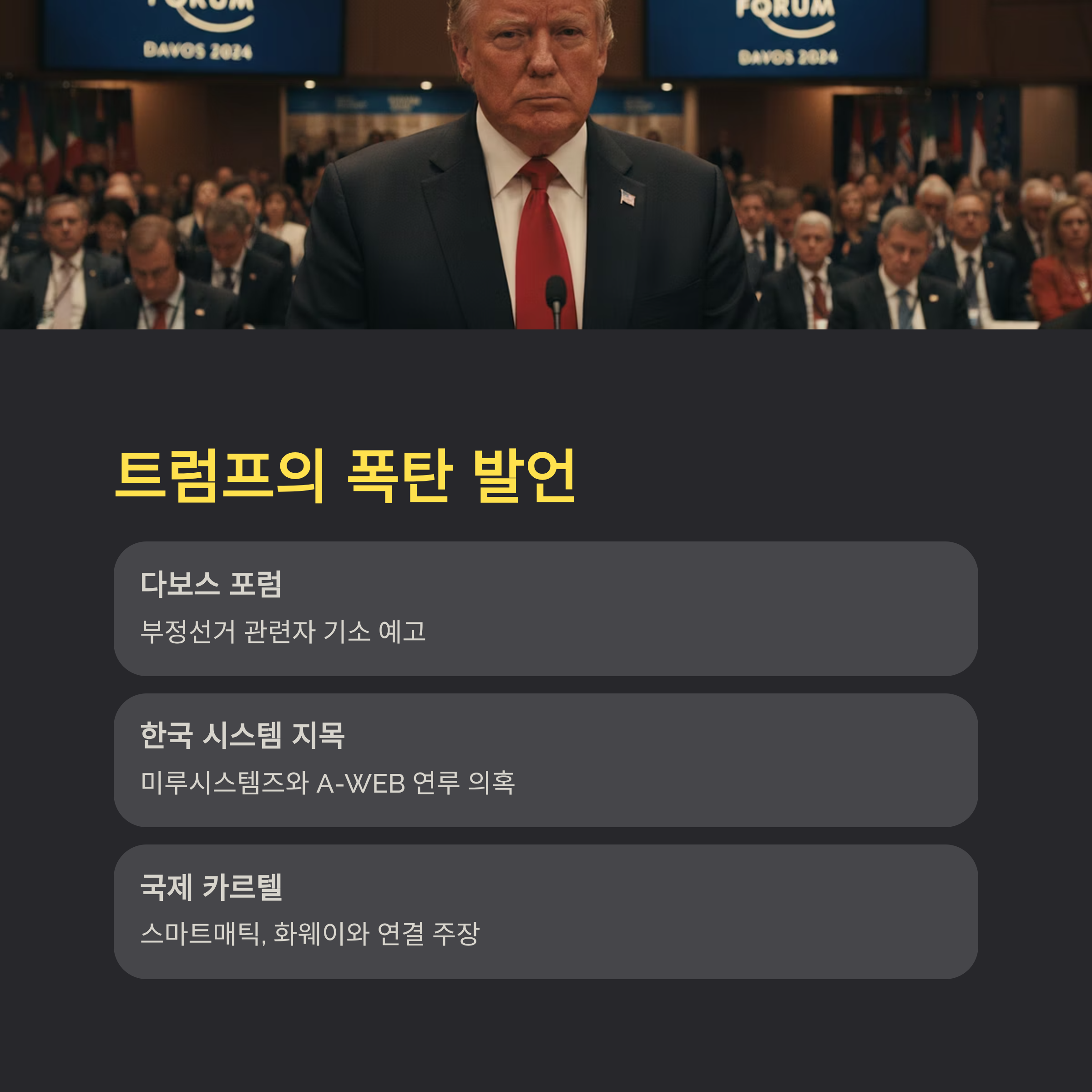 트럼프 대통령은 다보스 포럼에서 미국 내 부정선거가 한국의 선거 시스템 및 국제적 카르텔과 연계되어 있다고 주장하며 강력한 법적 대응을 시사했습니다. 특히 한국의 중앙선거관리위원회가 주도하여 설립한 A-WEB과 미루시스템즈가 콩고, 이라크 등 해외에 수출한 시스템이 부정선거 의혹의 중심에 섰다는 점이 강조되었습니다.
