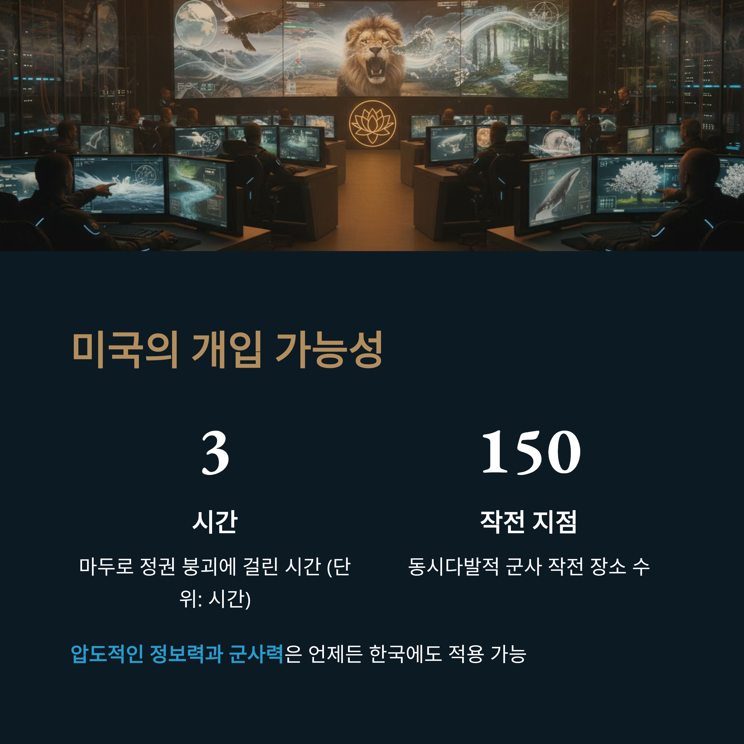 미국이 마두로 정권을 무너뜨리는 데 걸린 시간은 불과 3시간이었습니다. 150여 곳에서 동시다발적으로 진행된 작전은 미국의 정보력과 군사력이 현대전에서 얼마나 압도적인지를 전 세계에 각인시켰습니다. 이는 북한의 김정은뿐만 아니라, 친중 행보를 보이는 이재명 대통령에게도 엄청난 심리적 압박으로 작용할 것입니다. 미국은 군사적 옵션 외에도 관세 인상, 금융 제재, 주한미군 감축 등 한국을 무력화할 수 있는 다양한 '툴(Tool)'을 보유하고 있습니다.