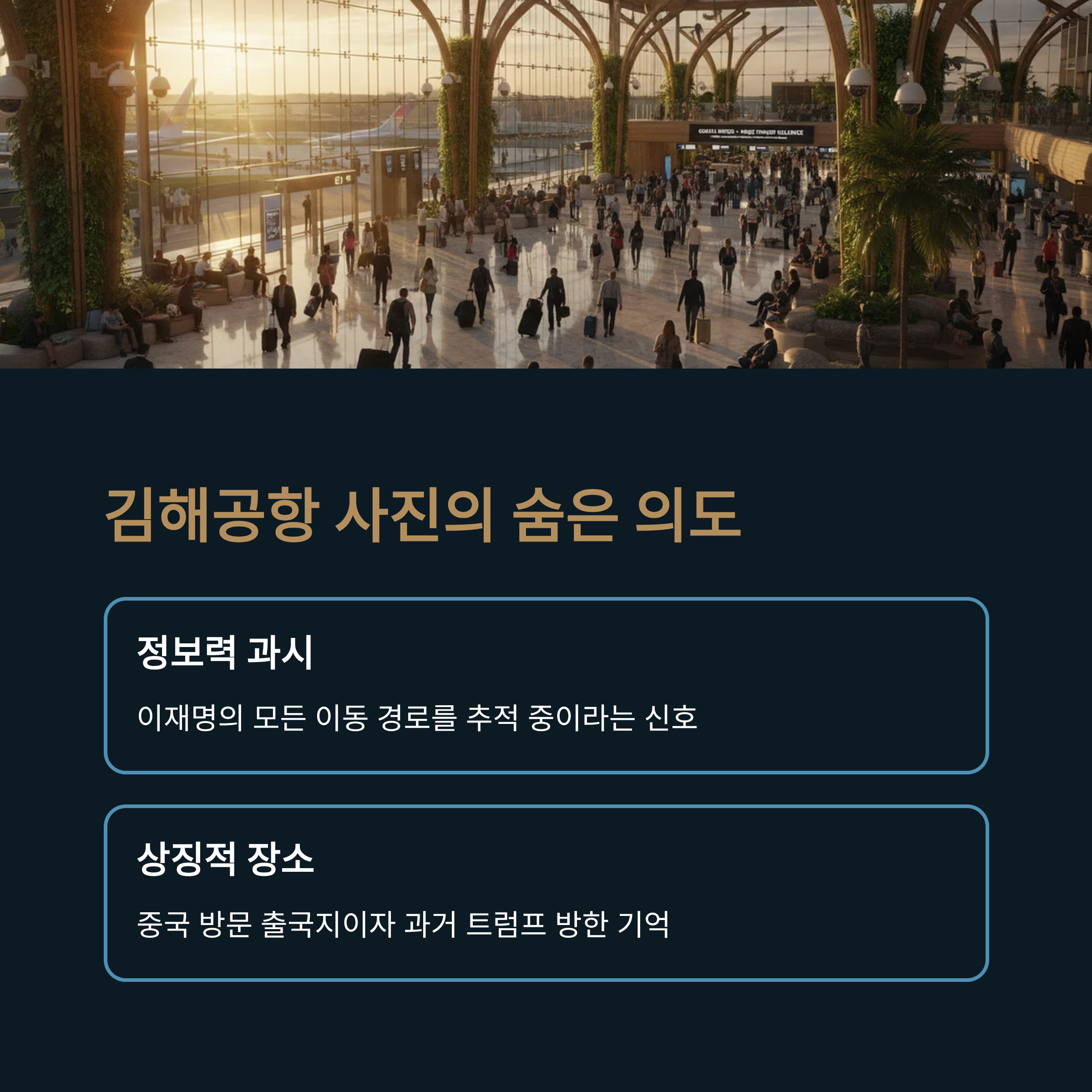 | A1. 김해국제공항은 이재명 대통령이 시진핑 주석을 만나기 위해 출국한 장소이자, 과거 트럼프 대통령 방한 당시의 기억이 얽힌 곳으로 추정됩니다. 이곳을 배경으로 'FAFO' 문구를 넣은 것은 이재명 대통령의 이동 경로를 다 지켜보고 있다는 미국의 정보력을 과시함과 동시에, 그의 친중 행보가 '선을 넘는 행위'임을 경고하는 상징적인 메시지입니다. |