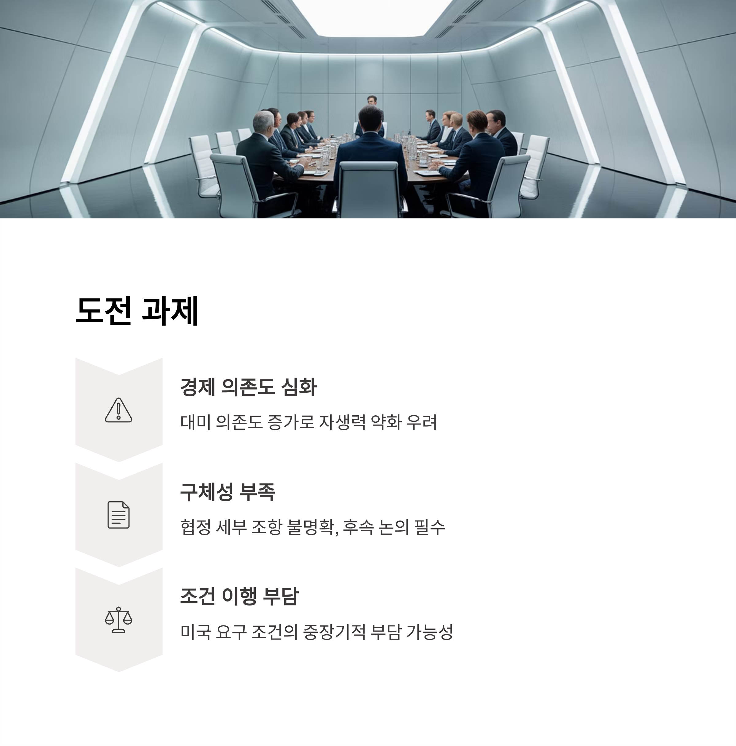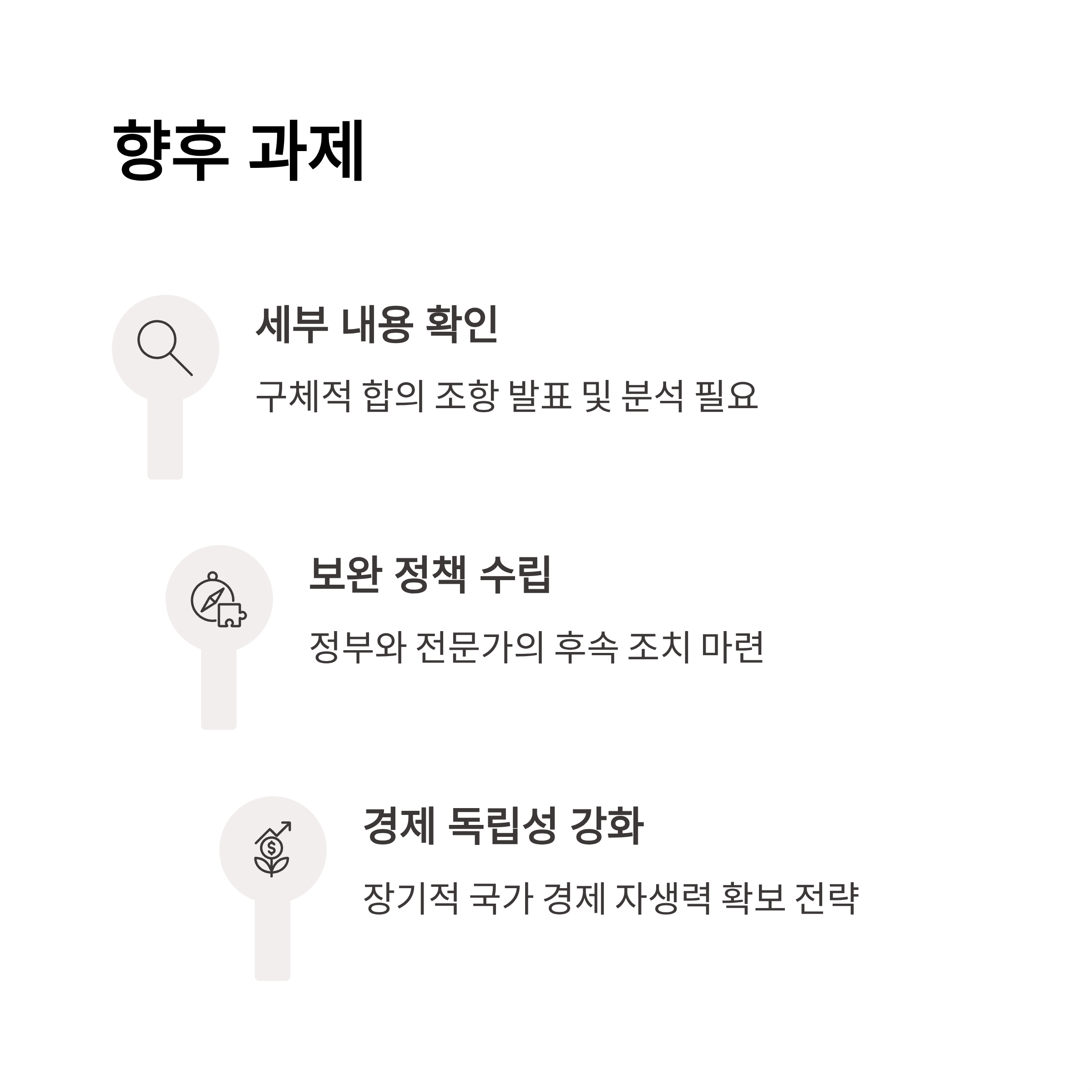 그러나 이번 협정은 한국이 미국에 대한 경제 의존도를 더욱 확대시킬 위험성을 내포하고 있습니다. 따라서 한국 정부는 이번 합의가 단기적 수익에 그치는 것을 넘어서 장기적 국가 경제의 독립성을 강화시키는 계기로 활용해야 할 것입니다. 또한, 구체적 합의 내용이 발표된 후, 정부와 전문가들은 이를 기반으로 후속 조치와 보완 정책을 구체화해야 합니다.