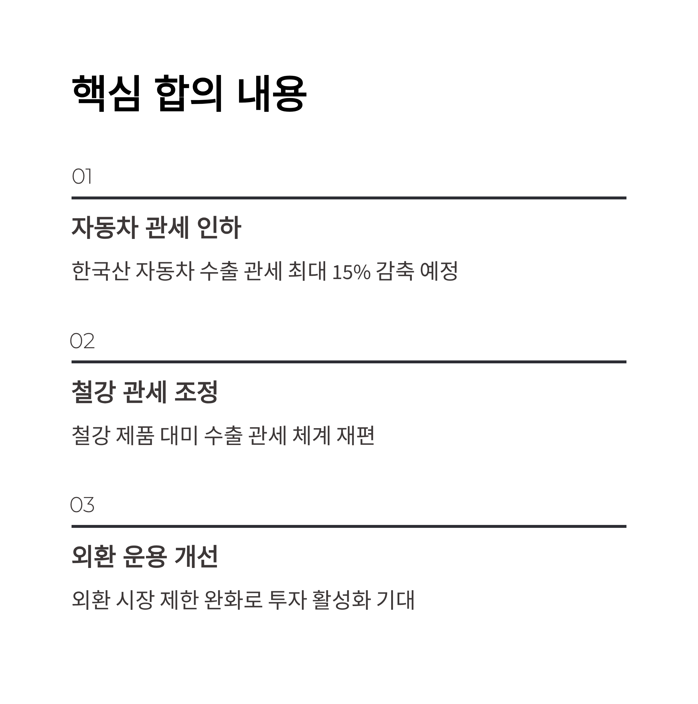 자동차 및 철강 관세 인하와 외환 운용 개선 조건이 포함될 가능성이 큽니다.