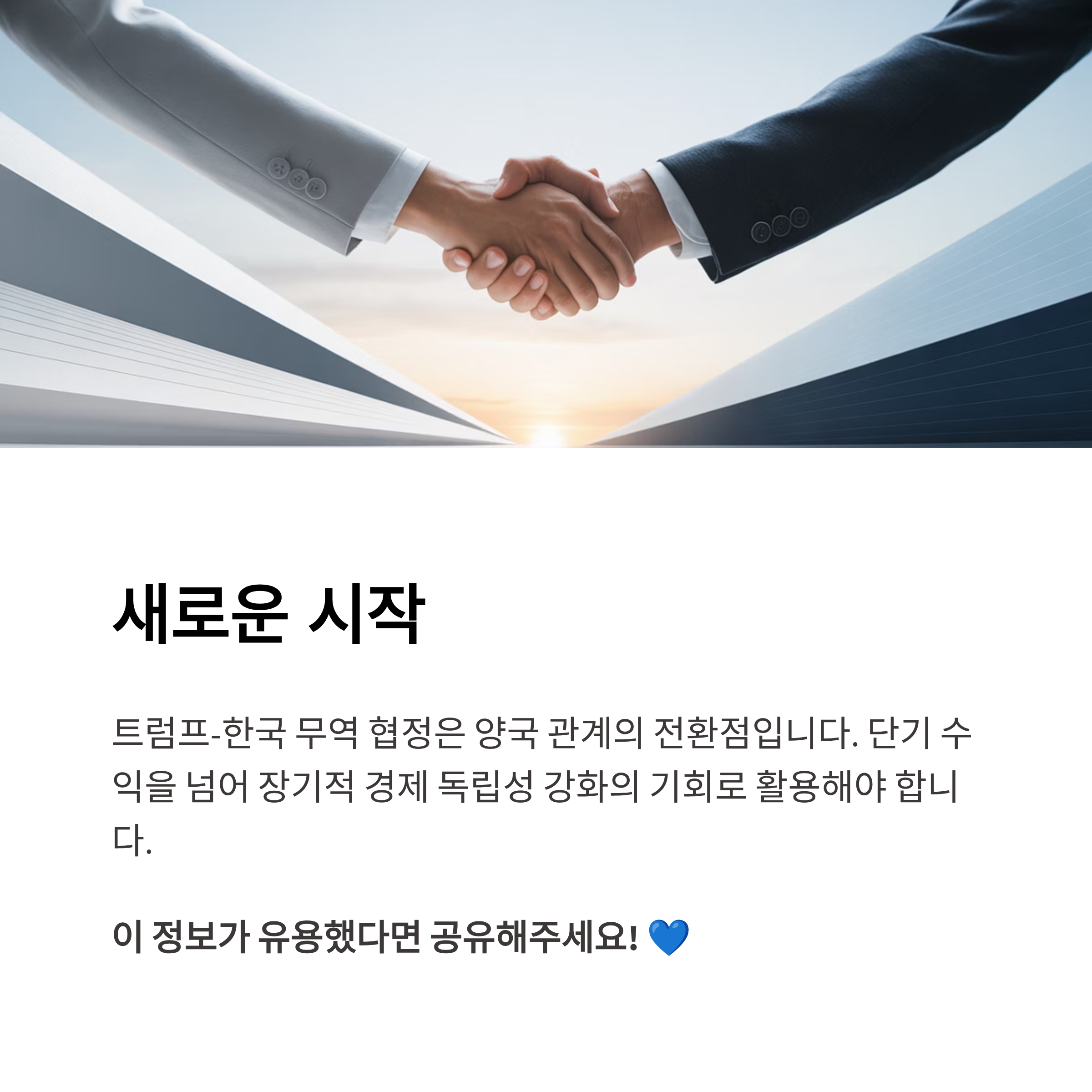 이번 트럼프-한국 무역 협정은 양국 관계에 새로운 국면을 여는 계기가 될 것입니다. 협상 과정에서 미국 주도의 경제 요구 조건이 강력히 드러났지만, 결과적으로 한국은 대미 수출의 안정성과 관세 혜택을 얻는 기회를 확보했습니다. 동시에 외환 운용 정책의 개선 가능성도 새롭게 부각되었습니다.