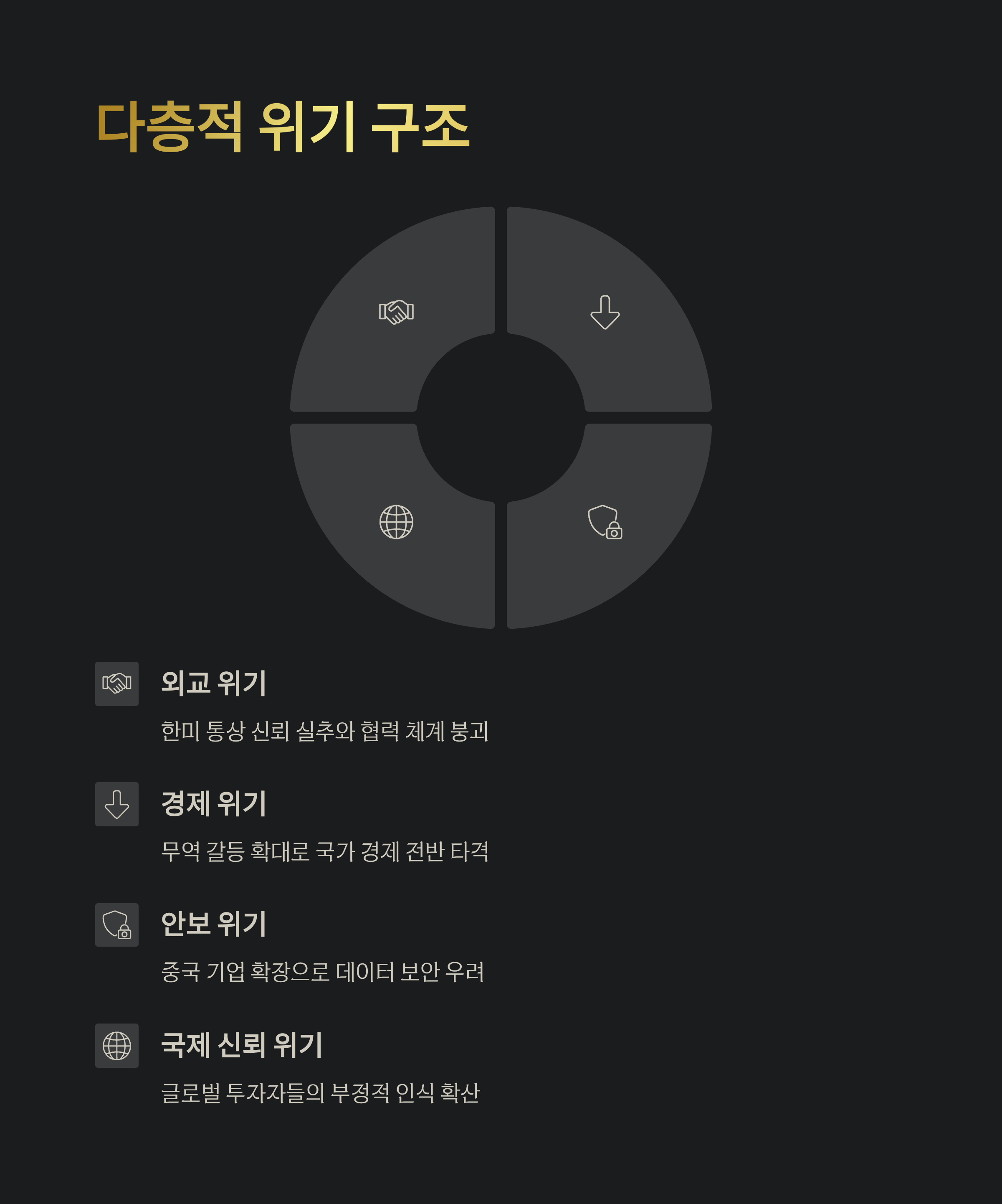 따라서 한국은 이번 사태를 단순한 기업 규제 문제가 아닌, 산업 정책 및 국가와 국민을 보호하기 위한 외롭게 다각적인 차원에서 검토해야 한다. 미국과의 협력을 유지하는 동시에, 중국 기업의 리스크를 최소화하는 방향으로 전략을 재설계해야 한다.