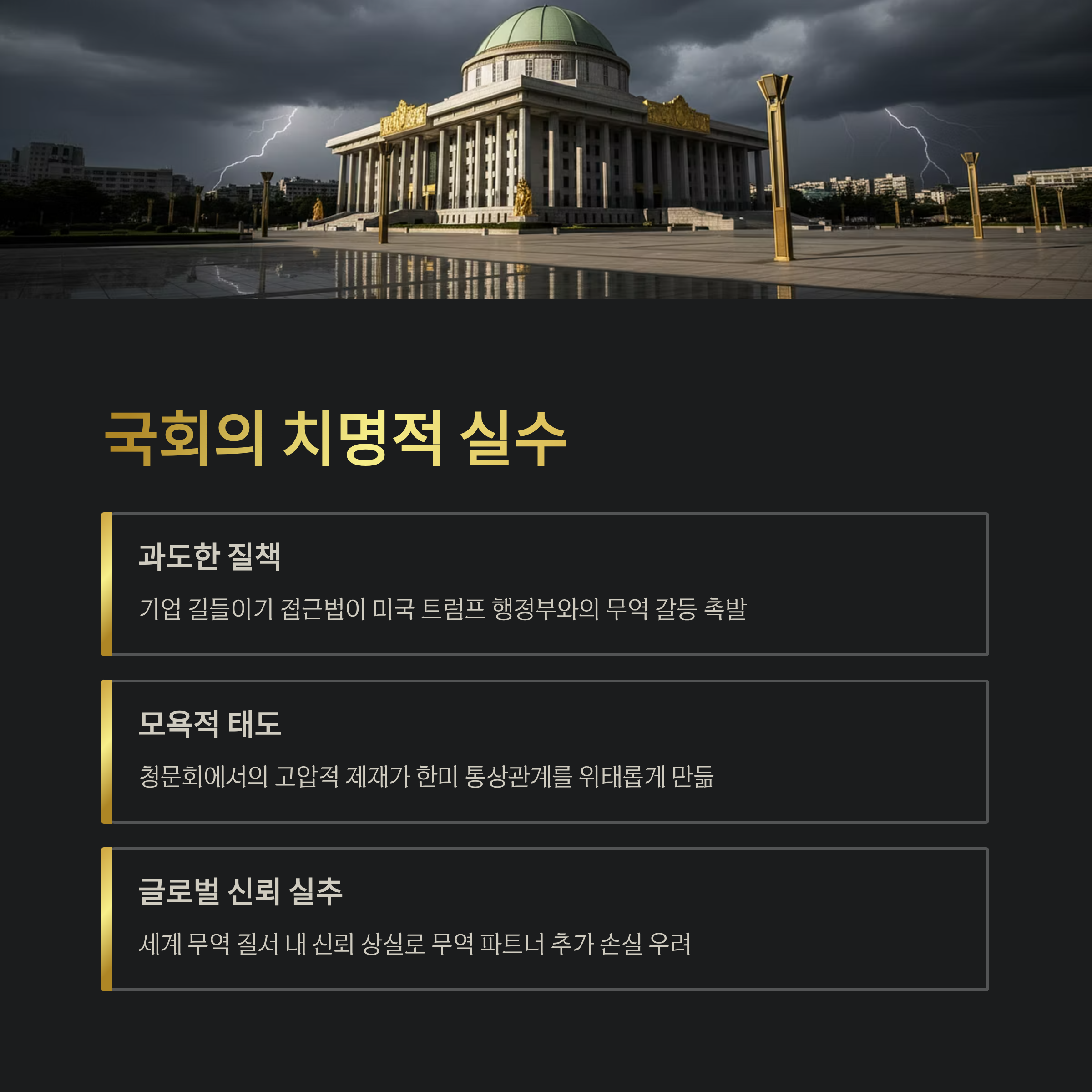 이번 사태의 핵심은 한국 국회의 과도한 질책과 규제를 통한 기업 길들이기 접근법이 미국 트럼프 행정부와의 무역 갈등을 촉발했다는 점이다. 특히 미국 기업인 쿠팡에 대한 고압적인 제재와 청문회에서의 모욕적 태도는 한미 통상관계를 위태롭게 만들었다. 미국 무역대표부가 한미 FTA 공동위원회 회의를 일방적으로 취소한 데 이어 추가 보복 조치 가능성이 논의되며, 한국 경제는 대외 의존도를 감안할 때 심각한 위기를 맞을 가능성이 크다.