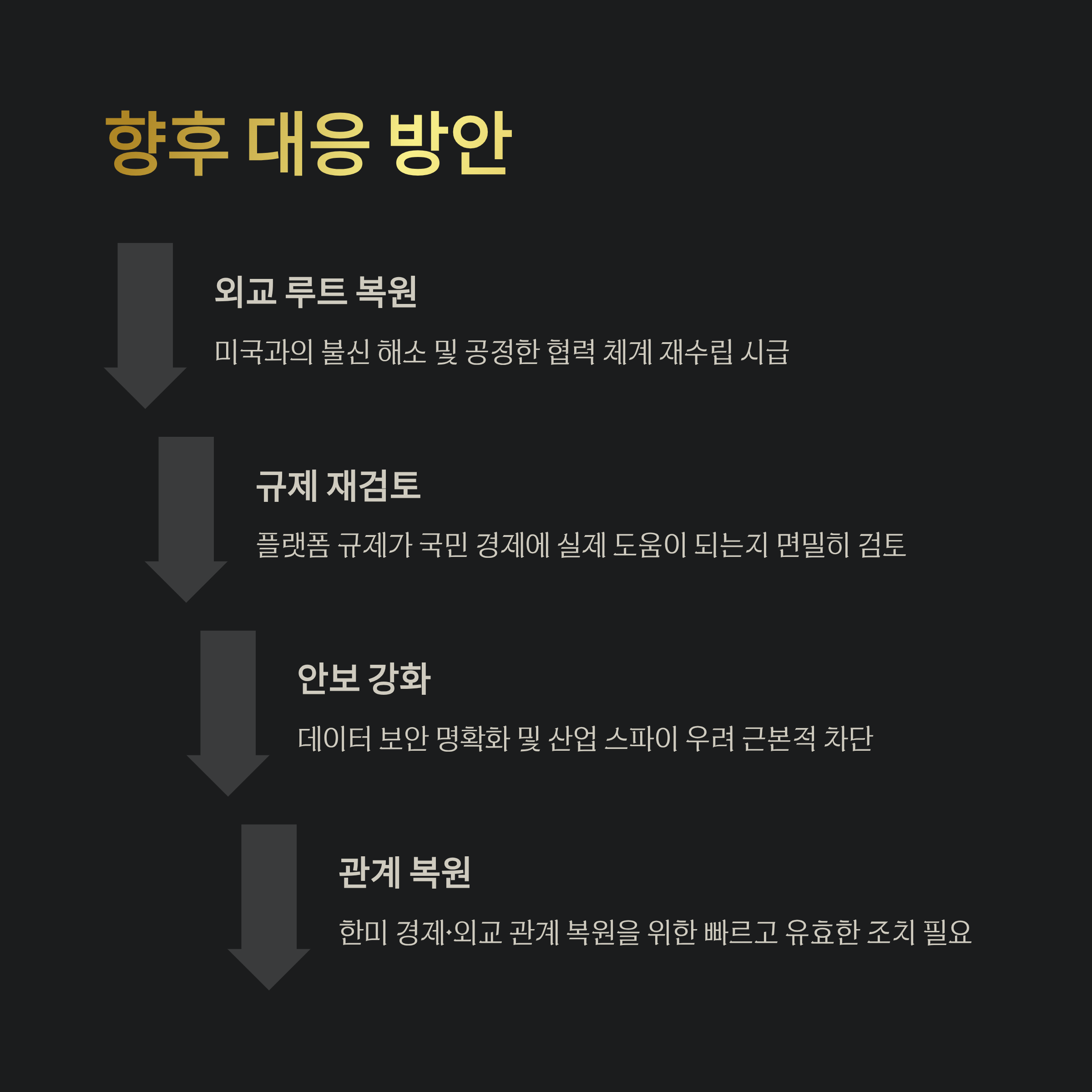 또한, 플랫폼 규제 강화가 국민 경제에 실제로 도움이 되는지 검토하고, 중국 기업들의 반사적 이익으로 이어지지 않도록 조치를 취해야 한다. 데이터 보안과 안보 문제를 명확히 규명하며, 이와 관련된 산업 스파이 우려를 근본적으로 차단하는 방안도 병행되어야 할 것이다. 궁극적으로 한미 경제 및 외교 관계의 복원이 가장 중요한 우선 과제로 여겨지며, 이를 위한 빠르고 유효한 조치가 절실하다.