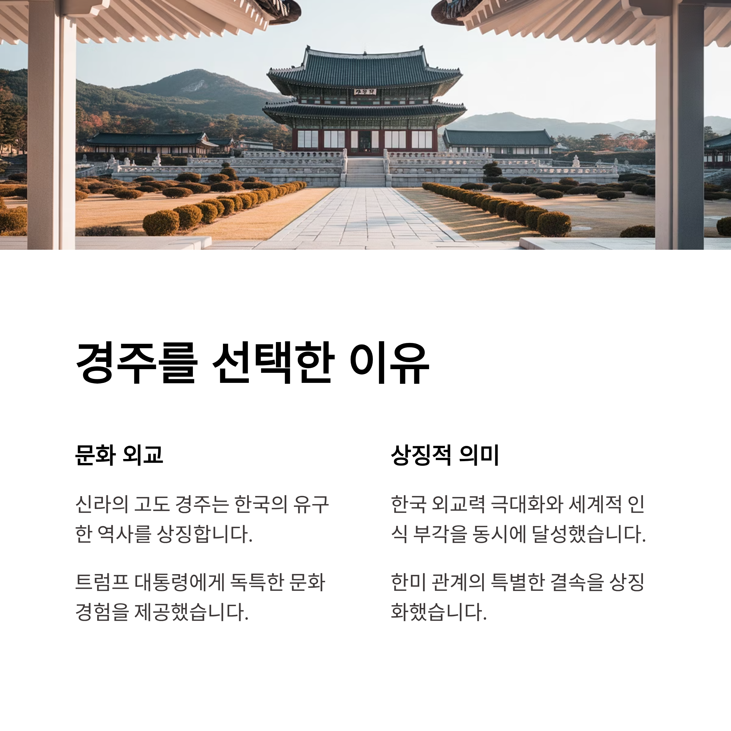 이번 경주 회담은 단순히 장소적인 특색을 넘어 한국 문화를 강조하고 한미 관계의 특별한 결속을 상징화하려는 의도로 분석된다. 경주는 신라의 고도이자 한국의 유구한 역사를 담은 문화유산이 풍부한 지역으로, 트럼프 대통령에게 독특한 문화 외교의 경험을 제공했다. 이재명 대통령은 경주라는 상징적인 장소를 통해 한국의 역사와 세계적인 인식을 동시에 부각시키며 한국 외교력을 극대화하려는 의지를 보였다.