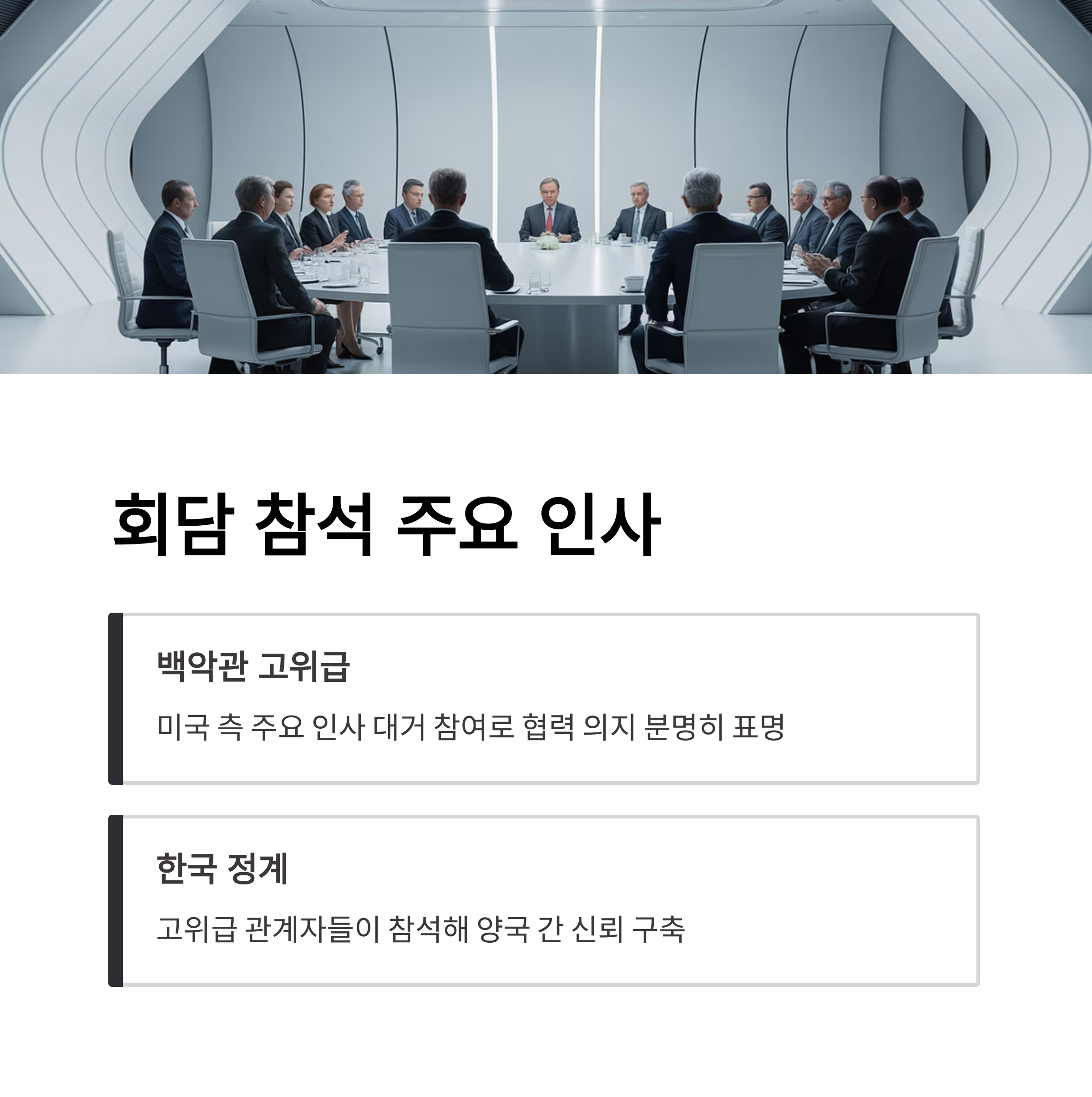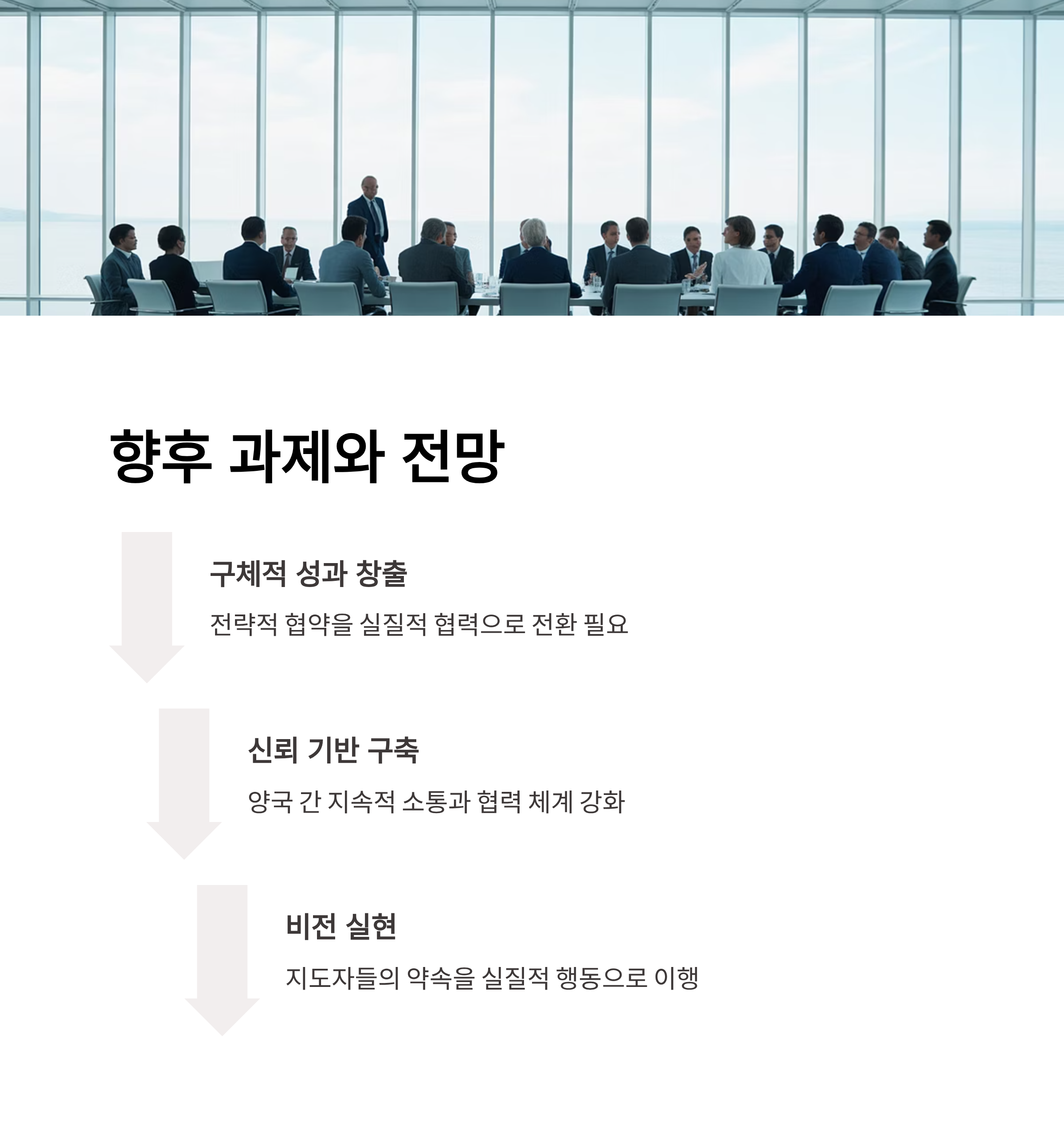 | A. 회담 결과가 실질적 성과로 이어지려면 양국의 전략적 협약과 기업 간 구체적 협력 실행이 중요합니다. 이를 통해 경제, 안보, 외교 모든 분야에서 다각적 성과를 달성할 잠재력이 높습니다. |