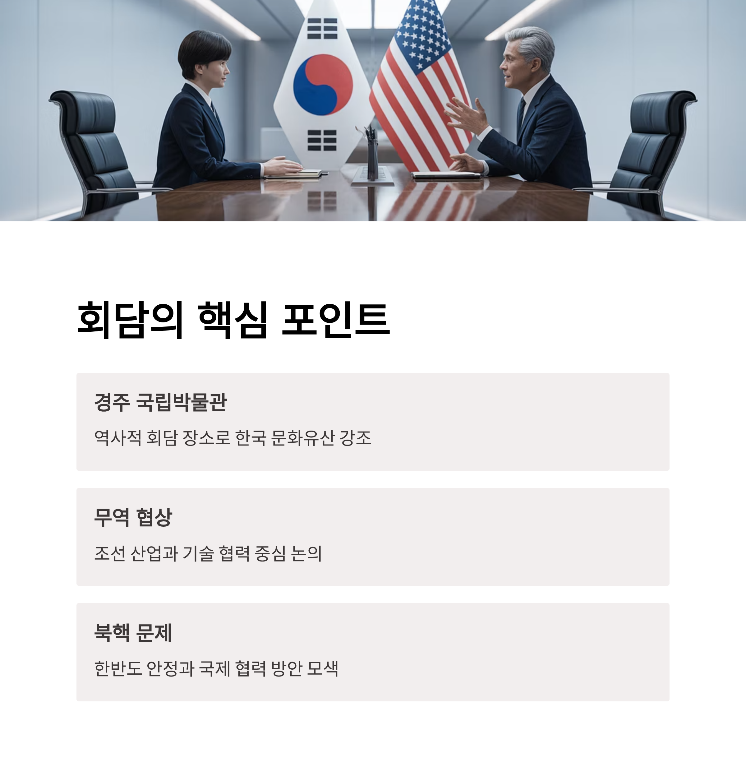 관련 태그: 경주, 트럼프 방한, 이재명 대통령, 정상회담, 한미 무역협상, 조선 산업, 외교협력, 북핵 문제