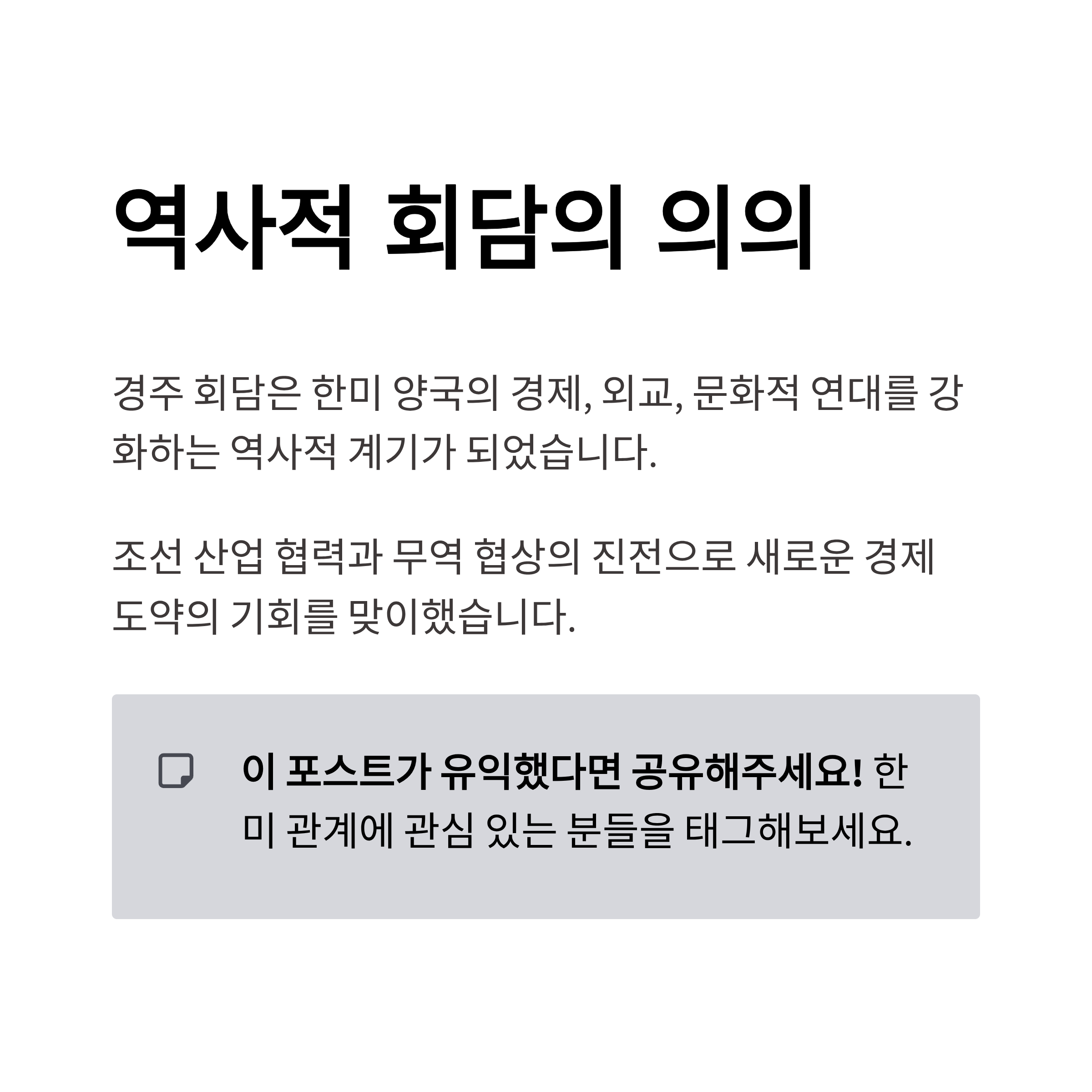 | A. 경주 회담은 한국의 문화적 가치를 알리고, 한미 간 경제 및 안보 동맹을 다지는 계기로 평가됩니다. 특히, 조선 산업 협력 및 경제 협력을 미래 지향적으로 발전시키는 데 논의가 집중되었습니다. |