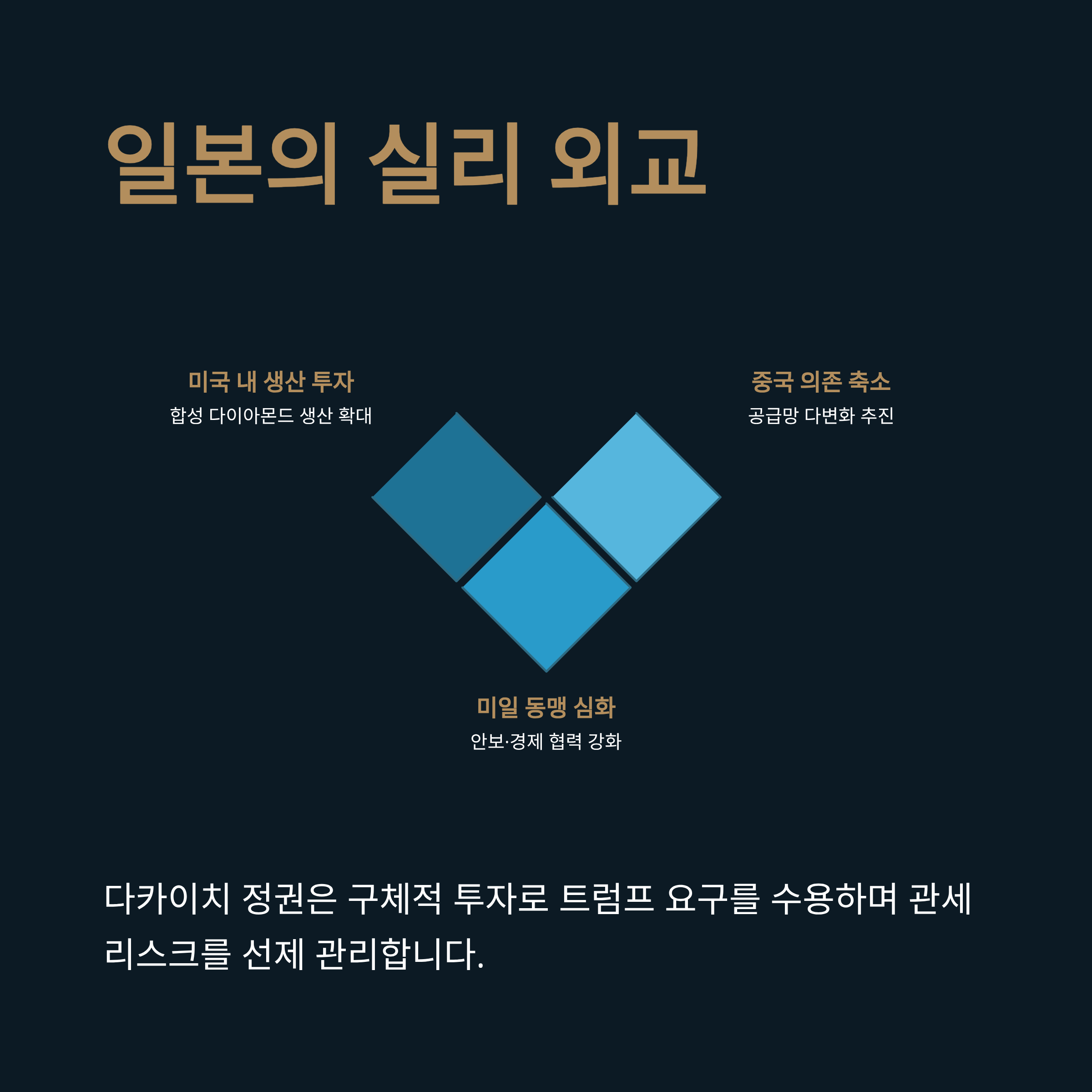 반면 일본의 다카이치 정권은 대미 투자 1호 프로젝트로 합성 다이아몬드 미국 생산을 추진하며 미일 동맹을 강화하고 있습니다.