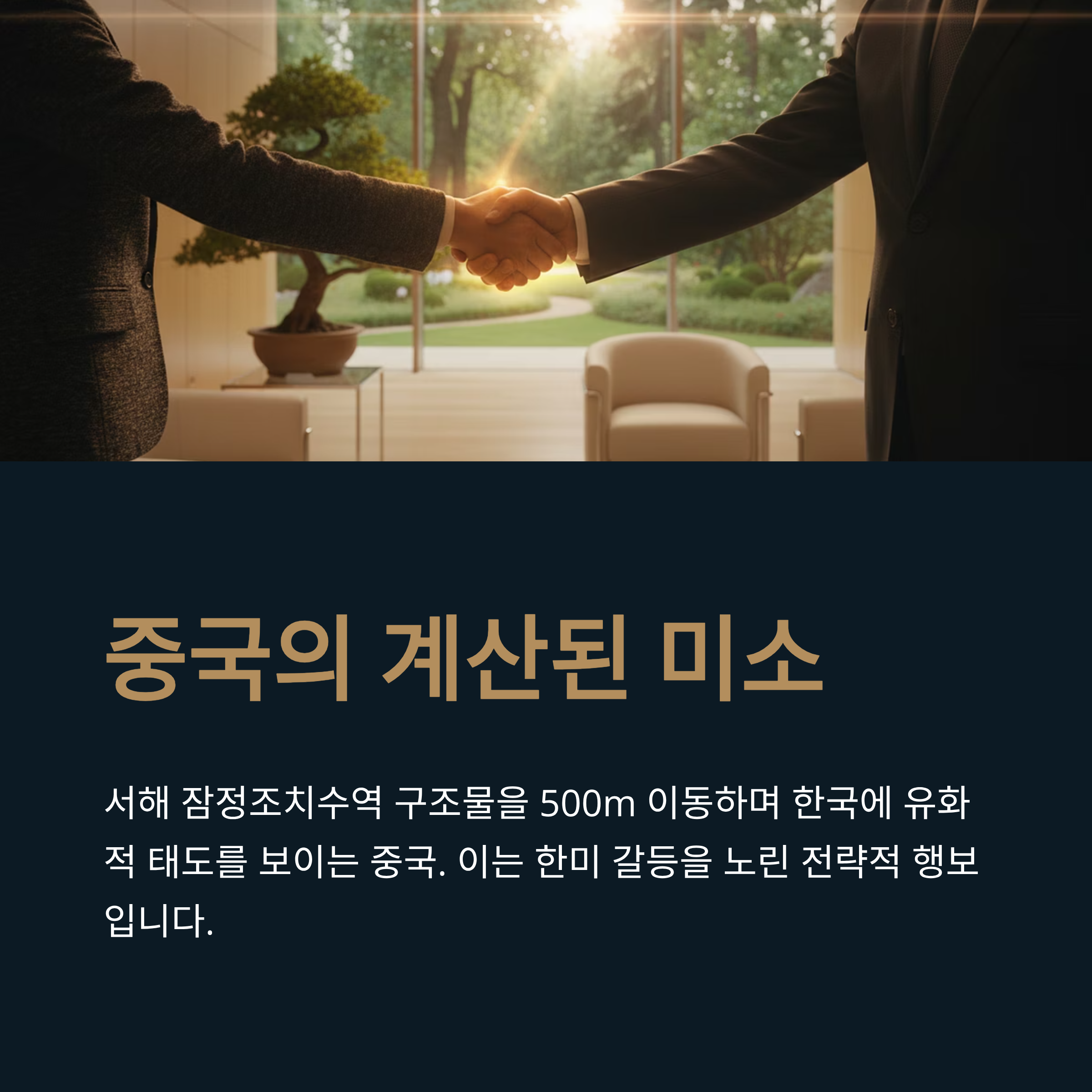 중국이 그동안 한국 정부의 수차례 항의와 정상회담에서의 언급에도 묵살해왔던 서해 PMZ 내 구조물을 500m 이동시킨 것은 단순한 호의가 아닙니다. 이는 트럼프의 관세 공격으로 한미 관계가 경색된 시점을 노린 철저히 계산된 행동입니다. 중국은 이번 조치를 통해 한국 정부와 여론이 미국에 실망감을 느끼고, 상대적으로 '말이 통하는' 중국 쪽으로 기울도록 유도하는 '갈라치기' 전략을 구사하고 있습니다. 또한, 이는 최근 중국을 방문했던 이재명 대통령의 외교적 성과로 포장되어 현 정권의 친중 기조를 강화하는 명분으로 활용되고 있습니다.
