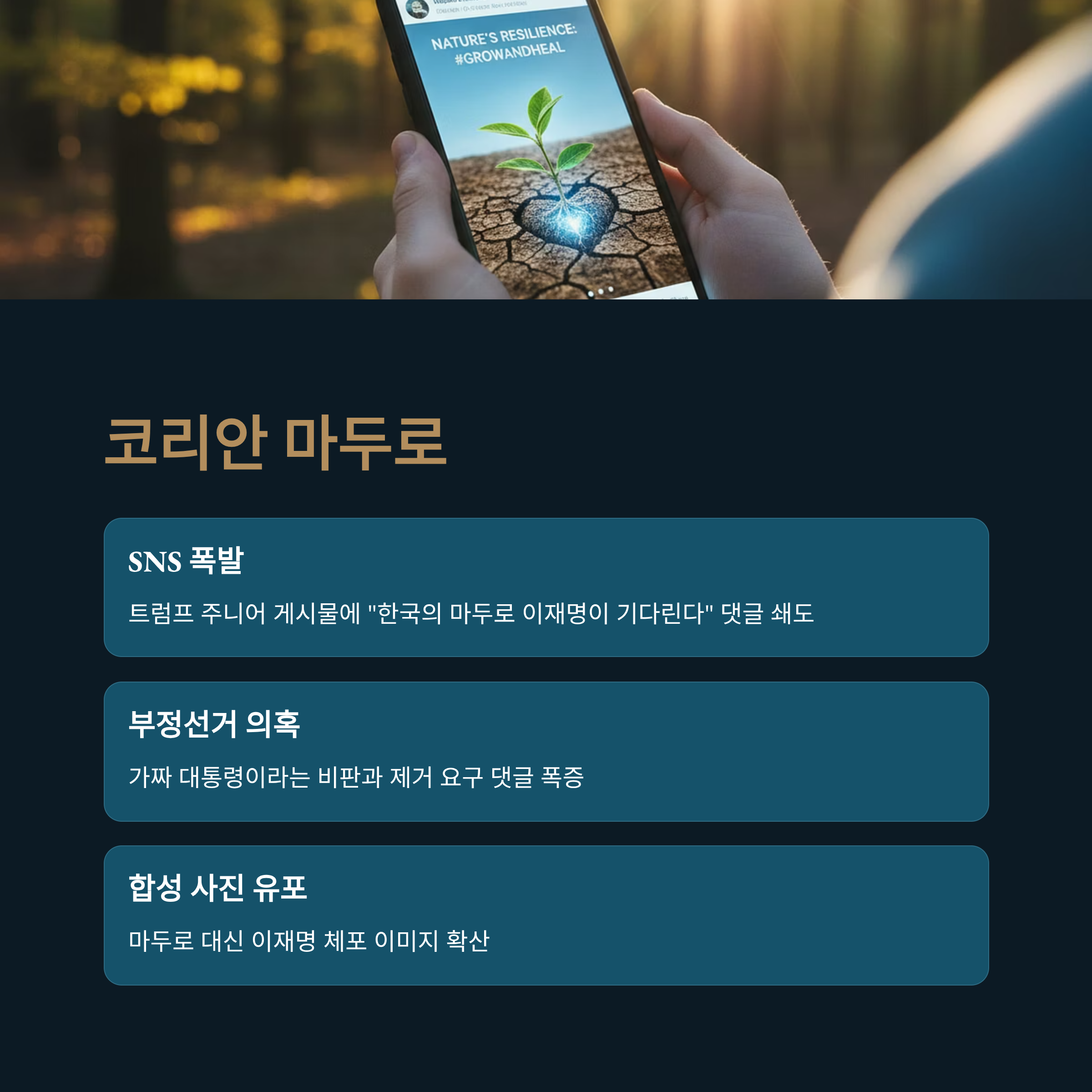 트럼프 주니어 SNS에서는 이재명 대통령을 '코리안 마두로'라 칭하며 부정선거 의혹을 제기하는 댓글이 큰 호응을 얻고 있습니다.