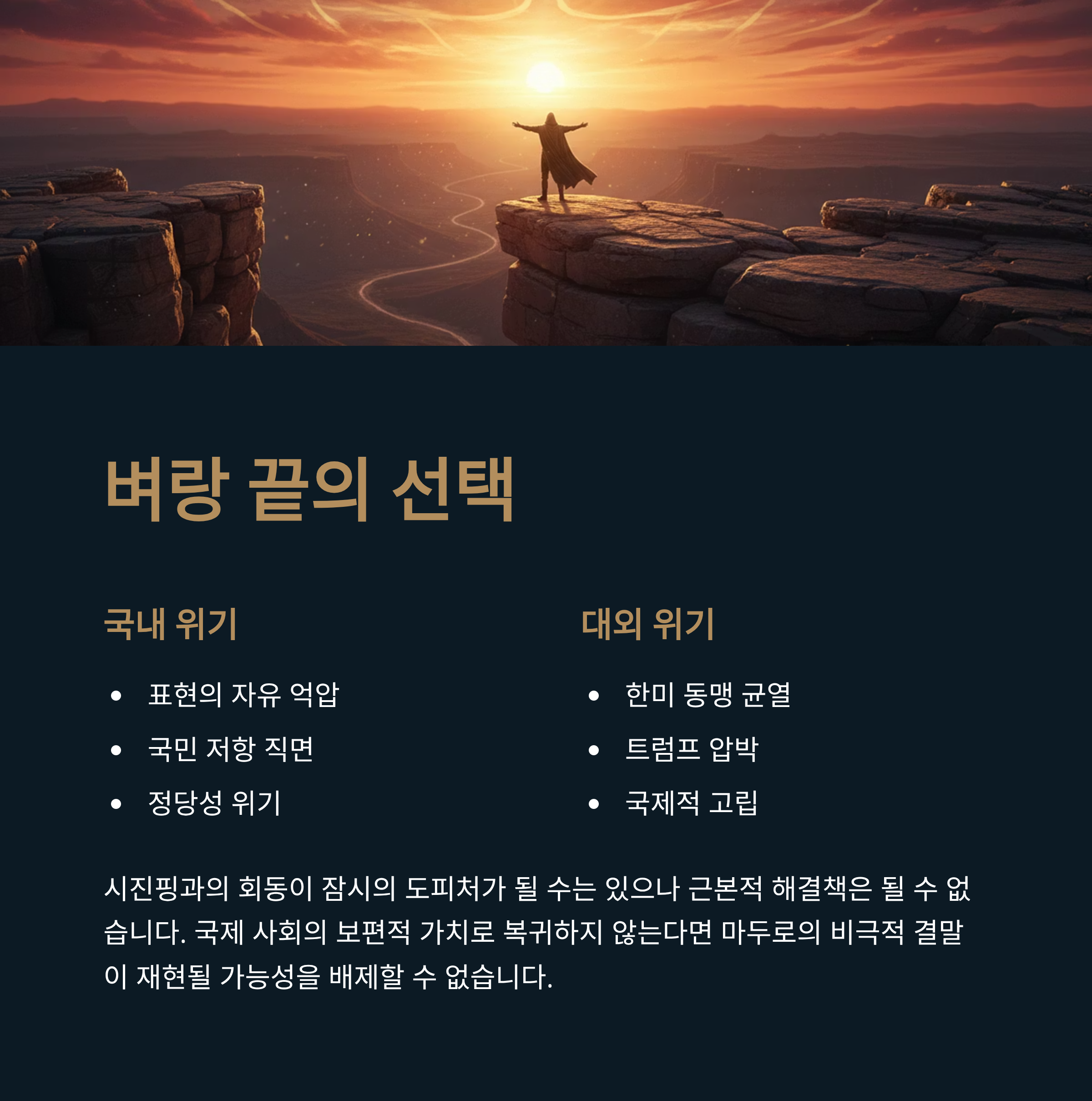 이재명 대통령은 현재 벼랑 끝에 서 있습니다. 국내적으로는 표현의 자유 억압과 실정으로 인한 국민의 저항에 직면해 있고, 대외적으로는 한미 동맹의 균열과 트럼프의 압박이라는 거대한 파도를 마주하고 있습니다. 시진핑 주석과의 긴급 회동이 잠시의 도피처가 될 수는 있겠으나, 근본적인 해결책이 될 수는 없습니다. 이재명 정부가 지금이라도 국제 사회의 보편적 가치로 복귀하지 않는다면, 마두로가 겪은 비극적인 결말이 한국 정치사에서 재현될 가능성을 배제할 수 없습니다.