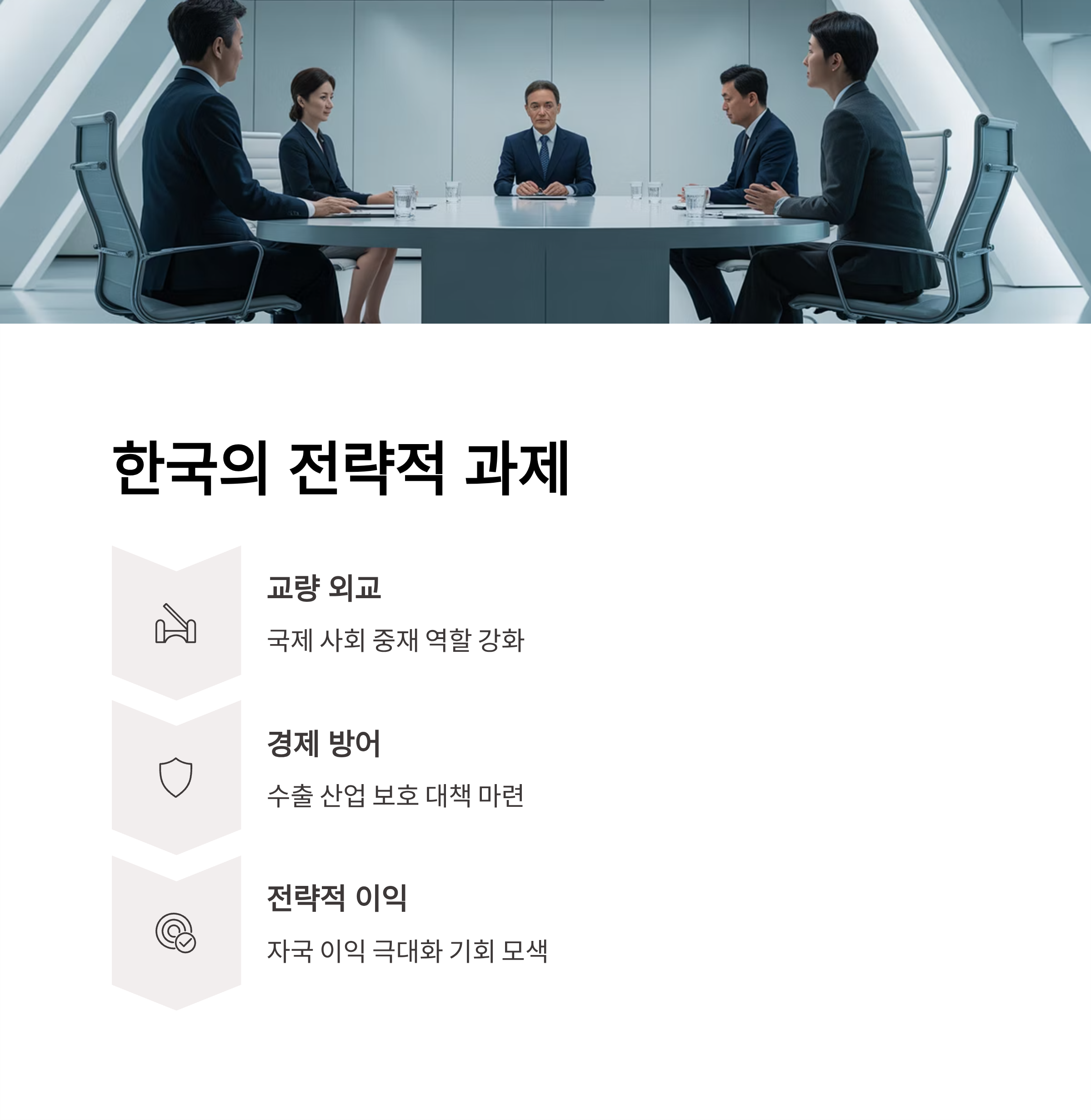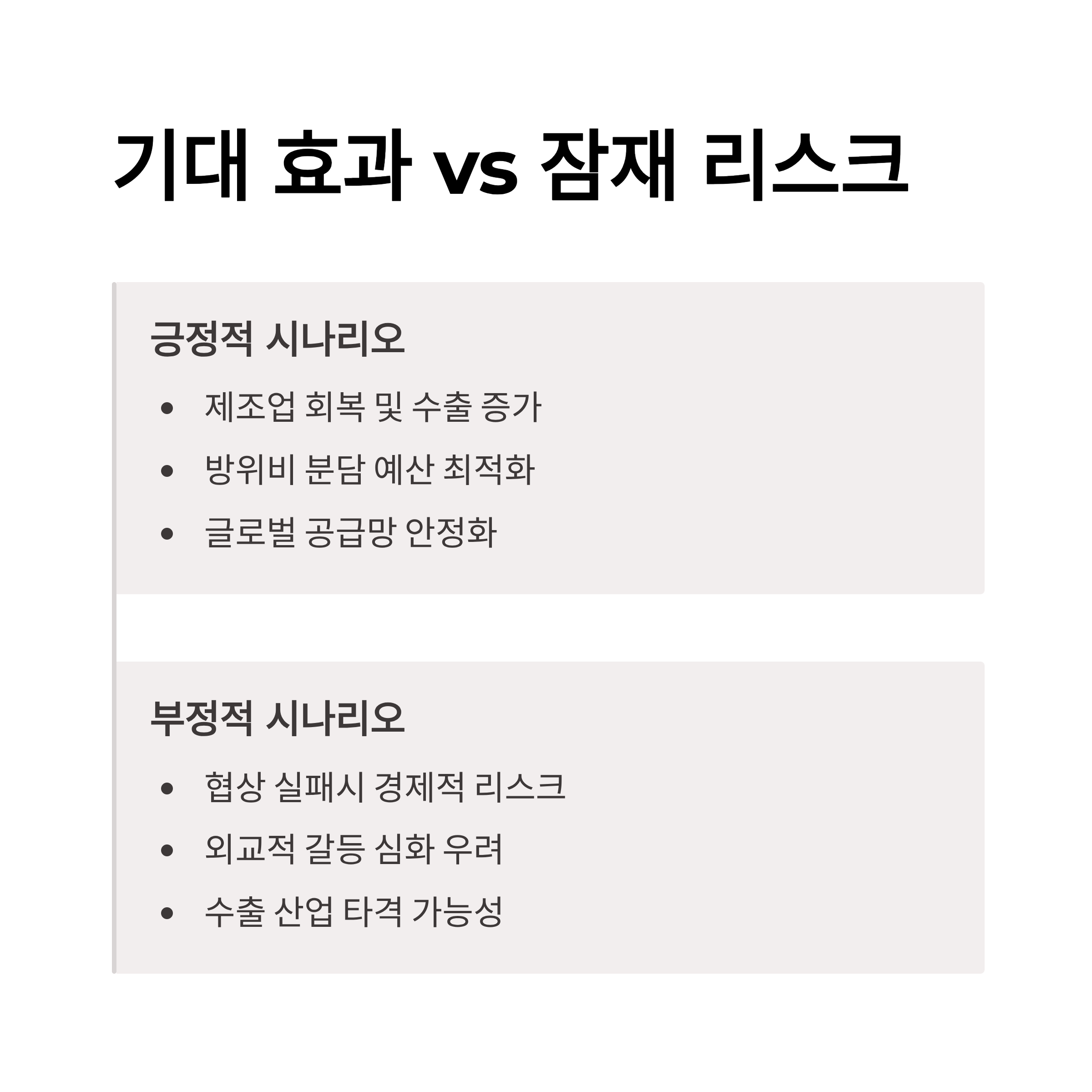 | A. 성공적인 한미 협의 결과는 제조업 회복 및 수출 증가, 방위비 분담 예산 최적화를 통해 한국 경제를 강화할 수 있다. |