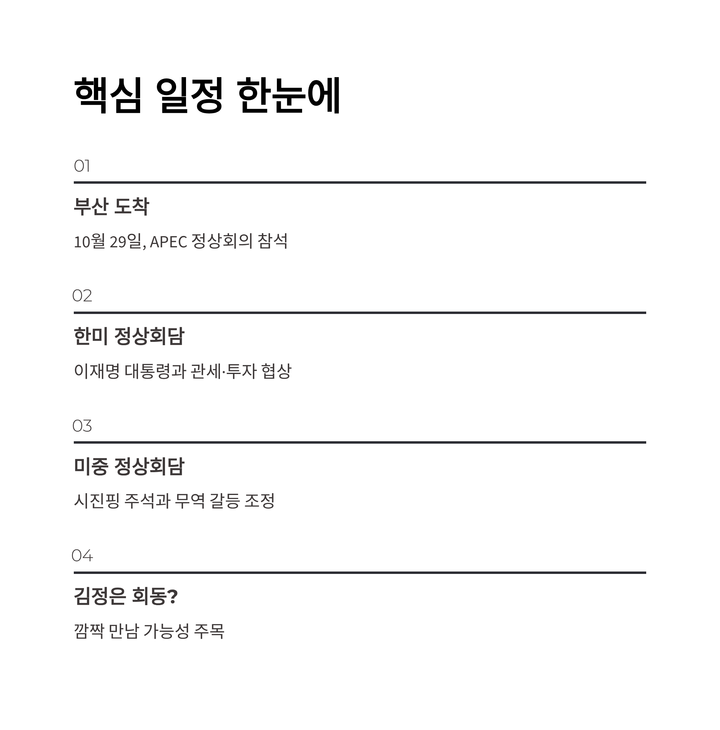 1. 트럼프 대통령은 10월 29일부터 30일까지 부산에 체류하며 이재명 대통령과의 정상회담을 진행합니다.