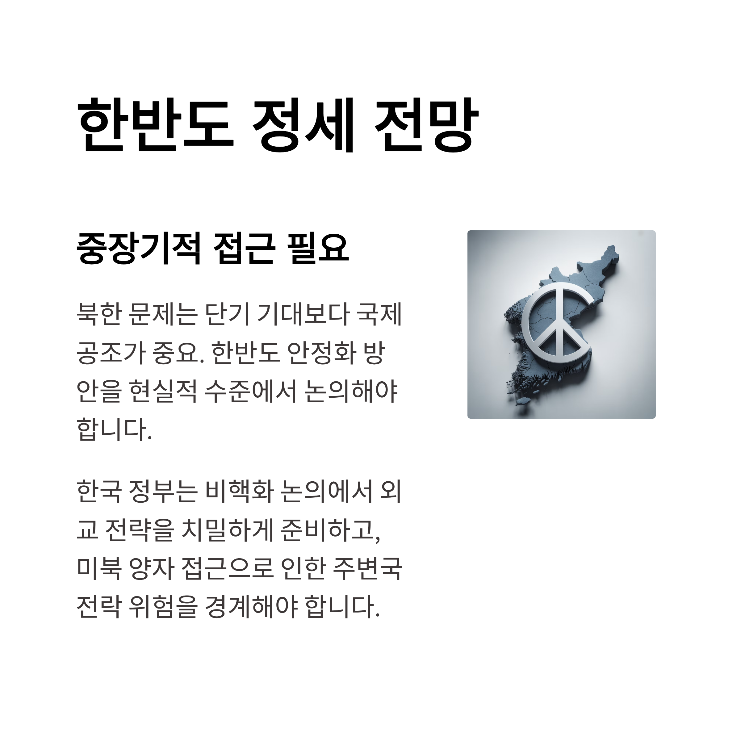 다만, 해당 회동 여부와 관계없이 한국은 비핵화 논의에서 중요한 상대국으로서의 입지를 잃지 않기 위해 외교 전략을 보다 치밀하게 준비해야 한다. 북한 문제는 단기적 기대보다는 중장기적 접근과 국제적 공조가 중요한 만큼, 한반도 안정화 방안이 현실적 수준에서 논의돼야 한다.