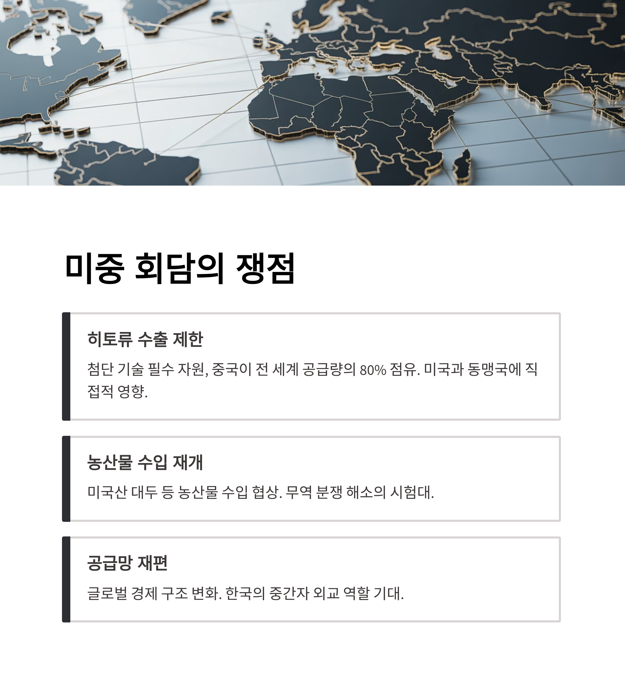 미국과 중국 두 강대국의 정상회담은 그 자체로도 글로벌 경제의 향방을 좌우할 만큼 중요하다. 이번 회담에서는 히토류 수출 제한 해제가 주요한 의제로 다뤄질 전망이다. 히토류는 첨단 기술 및 전자 제품 생산에 필수적인 자원으로 중국이 전 세계 수출량의 약 80%를 점유하고 있는 상황에서 이는 미국은 물론 한국 등 동맹국들에게도 직접적인 영향을 줄 것이다.