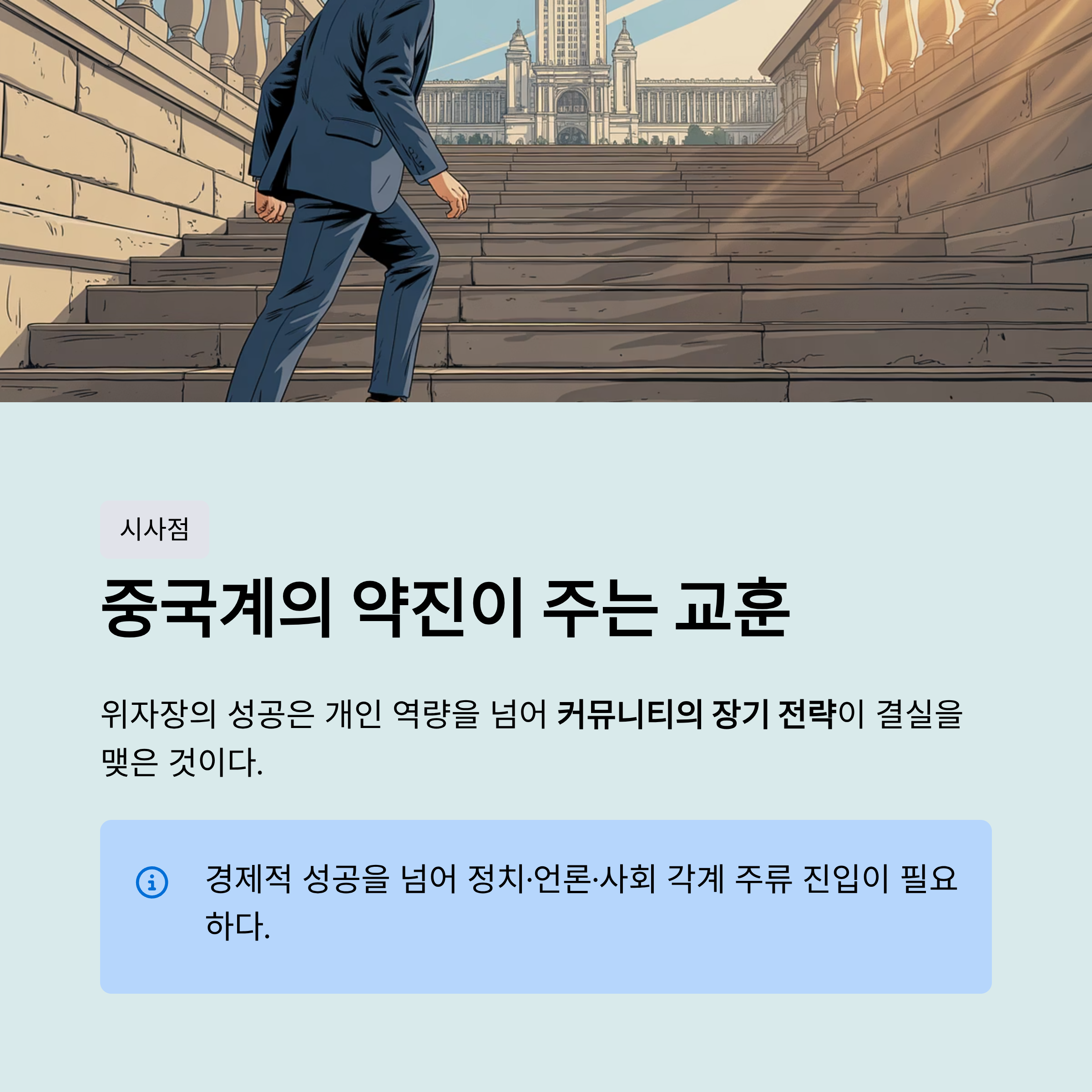 위자장 기자가 백악관 출입기자협회장이 된 것은 미국 사회 내 중국계의 영향력이 얼마나 성장했는지를 보여주는 중요한 사건입니다. 1983년 중국에서 태어나 두 살 때 미국으로 이민 온 그녀는, 웨스트버지니아에서 중국 식당을 운영하는 부모님 밑에서 자란 전형적인 1.5세대 이민자입니다. 그녀는 2023년 협회장 선거에서 압도적인 지지를 받아 당선되었으며, 이는 협회 역사상 최초의 유색인종 회장이자 최초의 중국계 회장이라는 기록을 세웠습니다. 이는 그녀 개인의 뛰어난 역량뿐만 아니라, 미국 주류 사회에 깊숙이 파고들어 핵심적인 역할을 수행하려는 중국계 커뮤니티의 전략과 노력이 결실을 본 것으로 해석할 수 있습니다. 이러한 중국계의 약진은 한국의 상황과 극명하게 대비됩니다. 그녀의 사례는 한국 언론과 교민 사회가 단순히 경제적 성공을 넘어 정치, 사회, 언론 등 각계각층의 주류로 진입하기 위한 장기적인 비전과 체계적인 노력이 얼마나 중요한지를 일깨워 줍니다. 권력의 중심부에서 자국의 목소리를 대변하고 영향력을 행사하는 인물을 키워내지 못한다면, 한국은 국제사회에서 그 위상에 걸맞은 대우를 받기 어려울 것입니다.