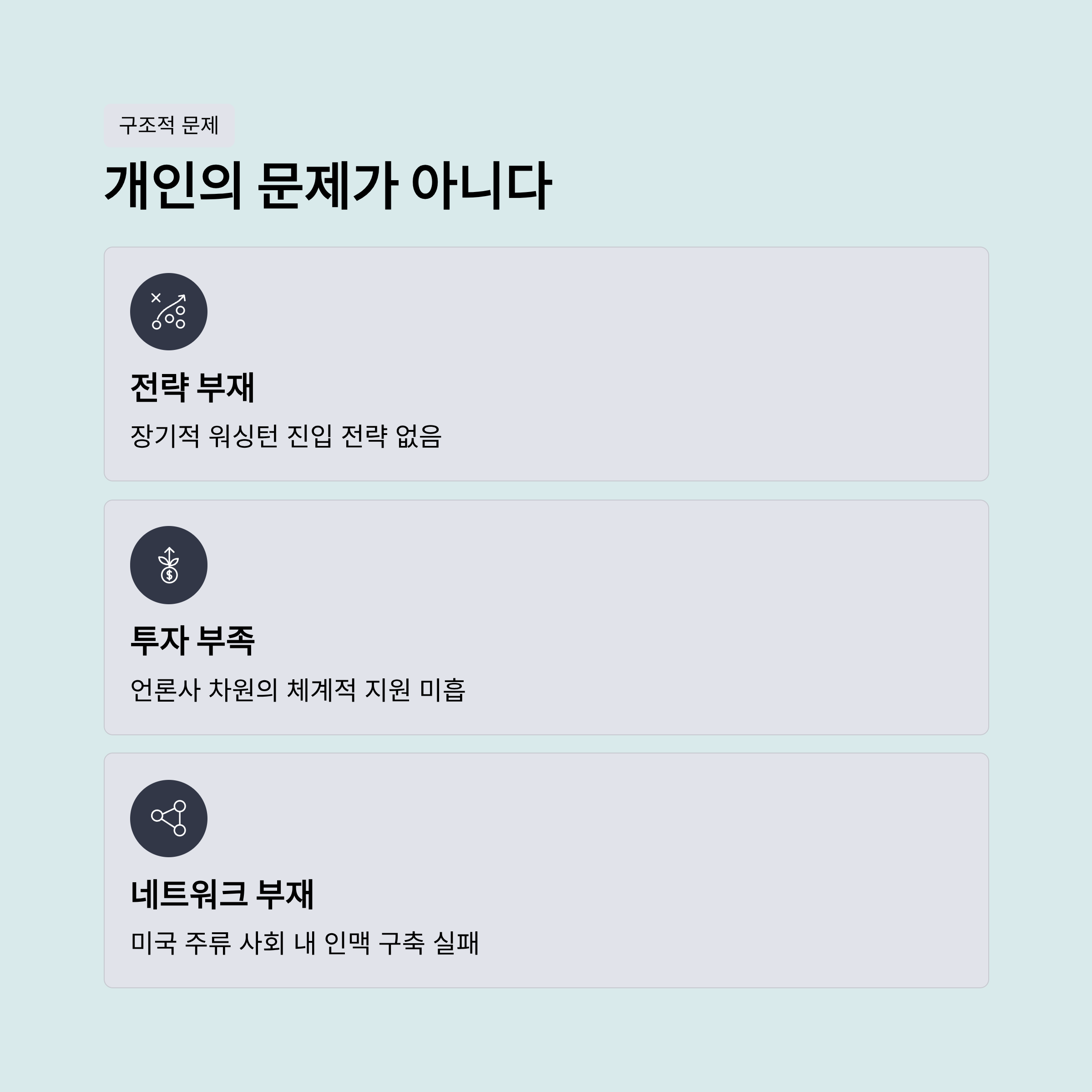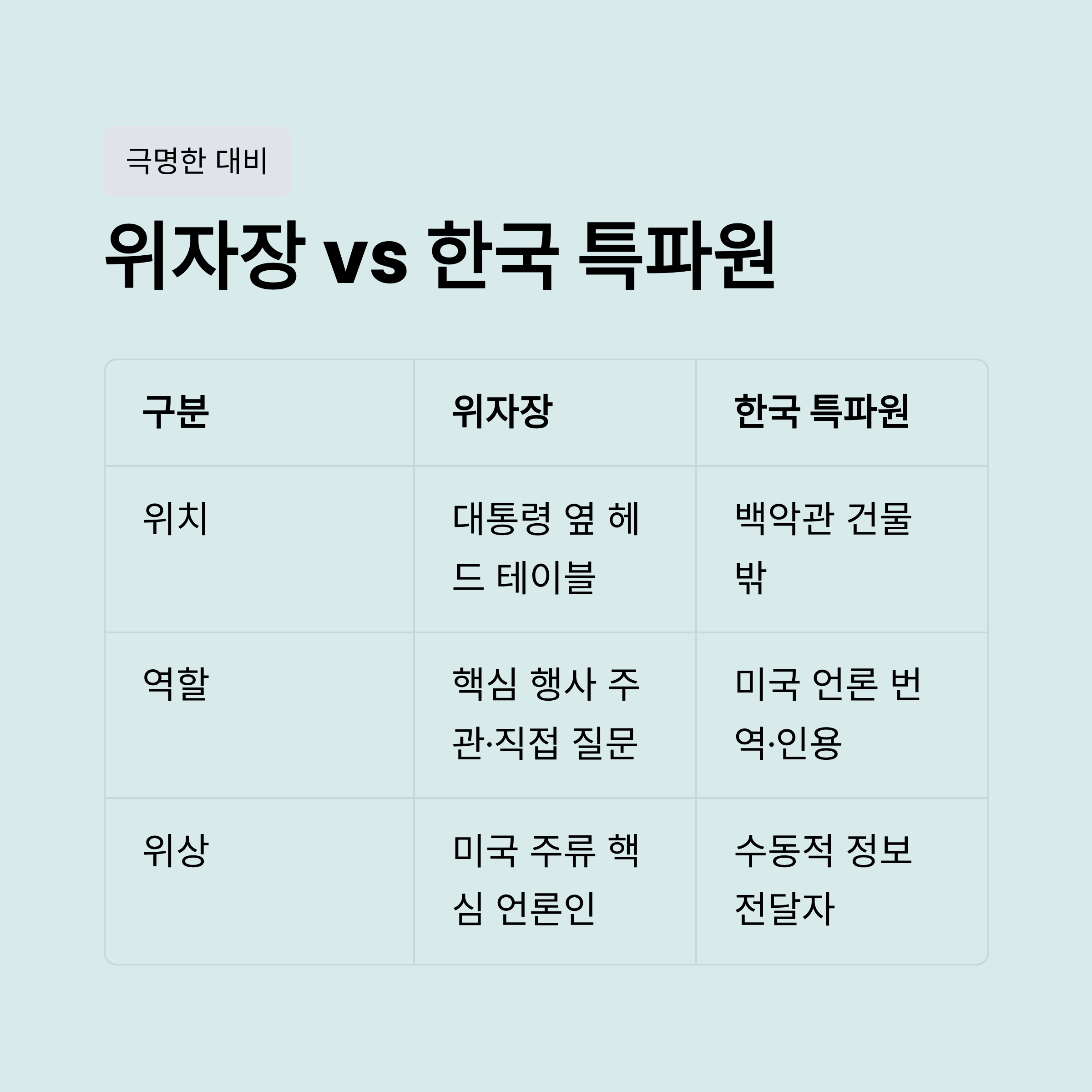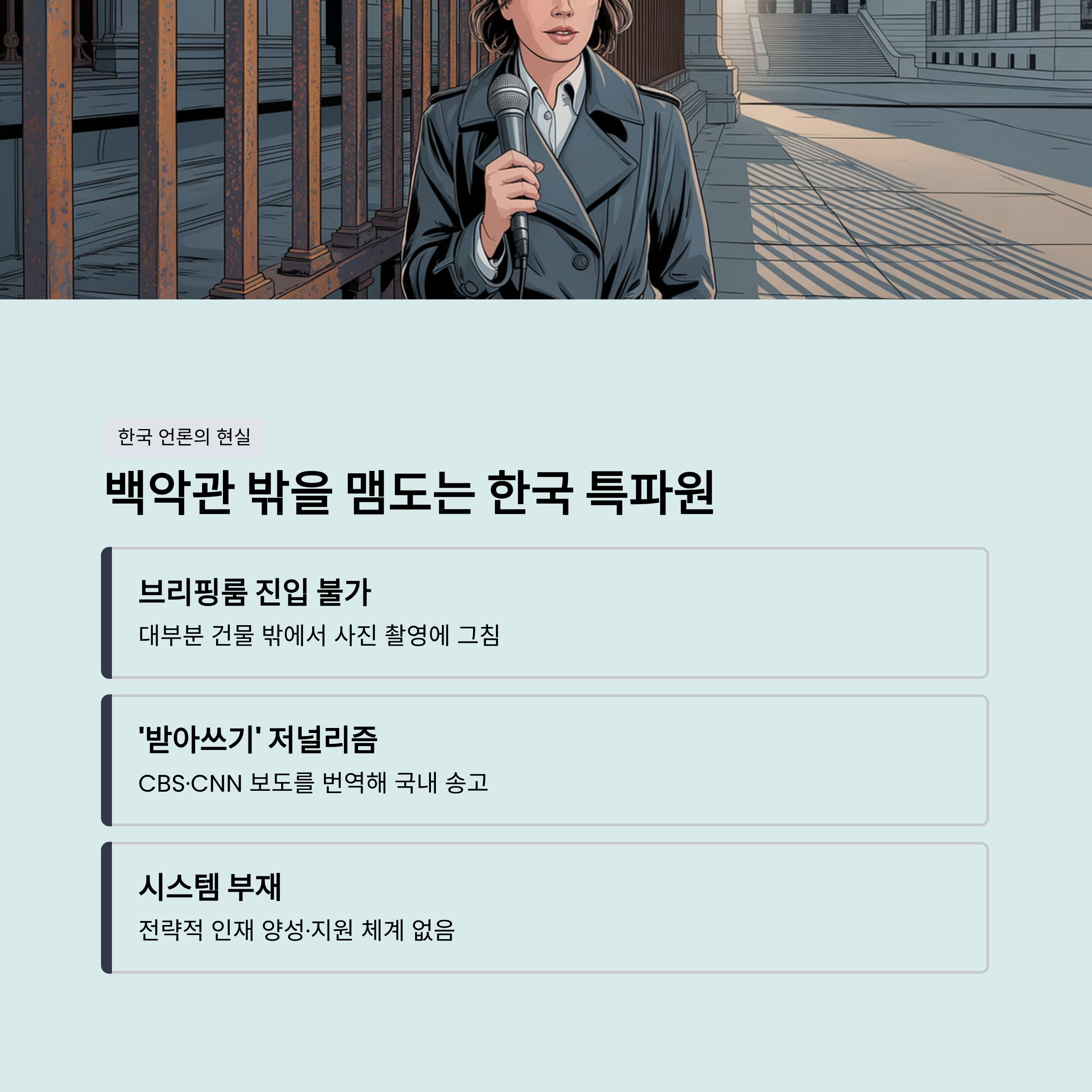 | A. 백악관 핵심부에 접근하지 못하고 직접 취재나 질문을 하지 못하는 점입니다. 이로 인해 미국 주류 언론의 보도를 그대로 번역해 전달하는 '받아쓰기' 수준에 머물러 있어, 독자적인 분석과 국익을 대변하는 목소리를 내지 못하고 있습니다. |
