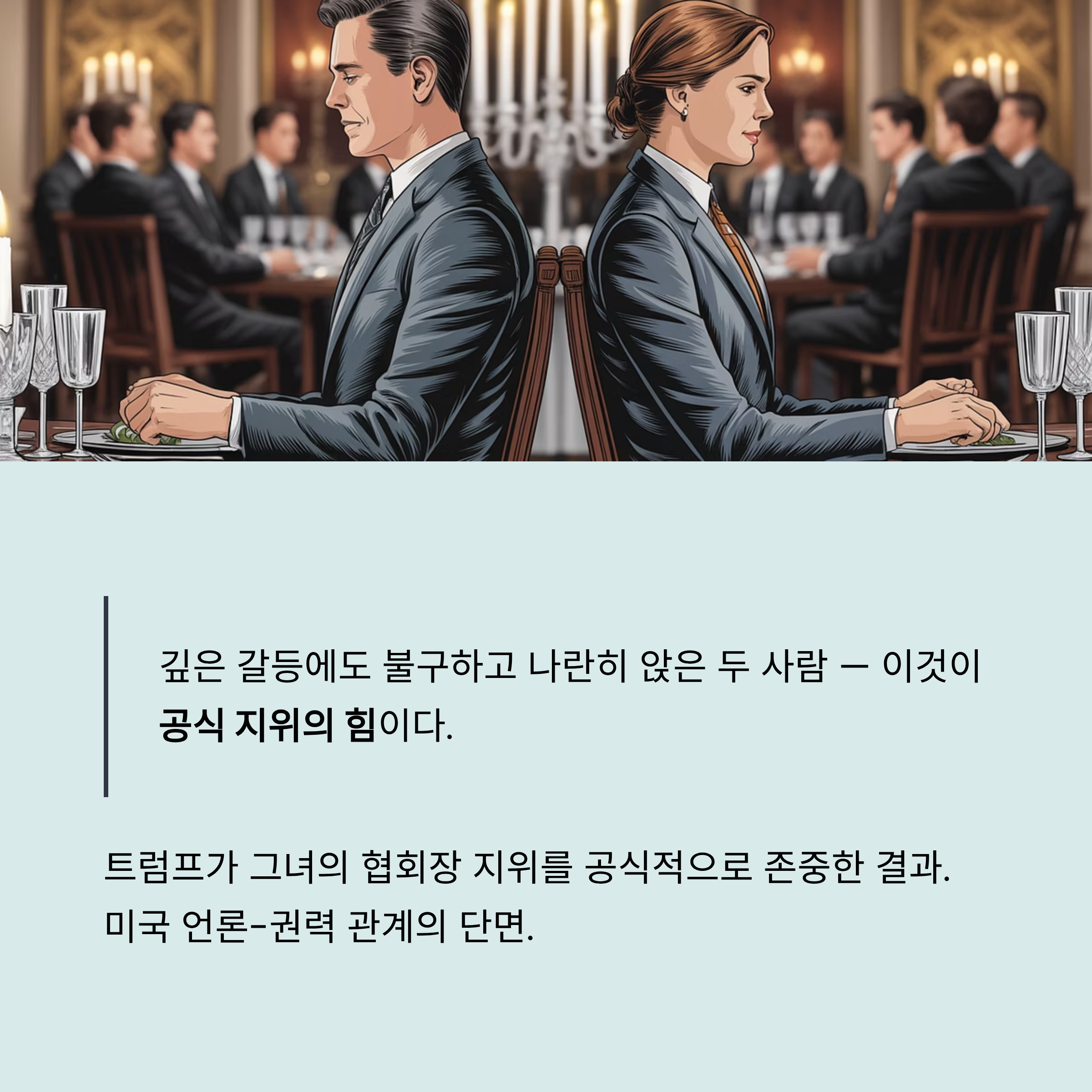 위자장 기자와 트럼프 전 대통령의 관계는 과거부터 매우 불편했습니다. 가장 큰 충돌은 2020년 코로나19 브리핑에서 발생했습니다. 위자장이 "매일 미국인이 죽어 나가는데 왜 코로나 테스트 수를 글로벌 경쟁으로 보느냐"는 도발적인 질문을 던지자, 트럼프는 "그 질문은 중국에 가서나 해라(Ask China)"라고 쏘아붙이며 인종차별적이라는 비판을 받았습니다. 트럼프는 이후에도 그녀의 질문에 "목소리를 낮춰라", "부끄러운 줄 알아라" 등의 모욕적인 발언을 하며 공개적으로 적대감을 드러냈습니다. 이러한 악연은 위자장 개인을 넘어 그녀가 소속된 CBS 방송사와도 이어졌습니다. 이처럼 깊은 갈등 관계에 있던 두 사람이 백악관 출입기자협회 만찬의 헤드 테이블에 나란히 앉은 장면은 그 자체로 매우 상징적입니다. 이는 협회장이라는 그녀의 공식적인 지위를 트럼프가 존중한 결과이지만, 내심으로는 양측 모두에게 껄끄러운 자리였을 것입니다. 이 어색한 동석은 미국 사회의 복잡한 역학과 언론-권력 관계의 단면을 보여주는 흥미로운 장면으로 평가됩니다.