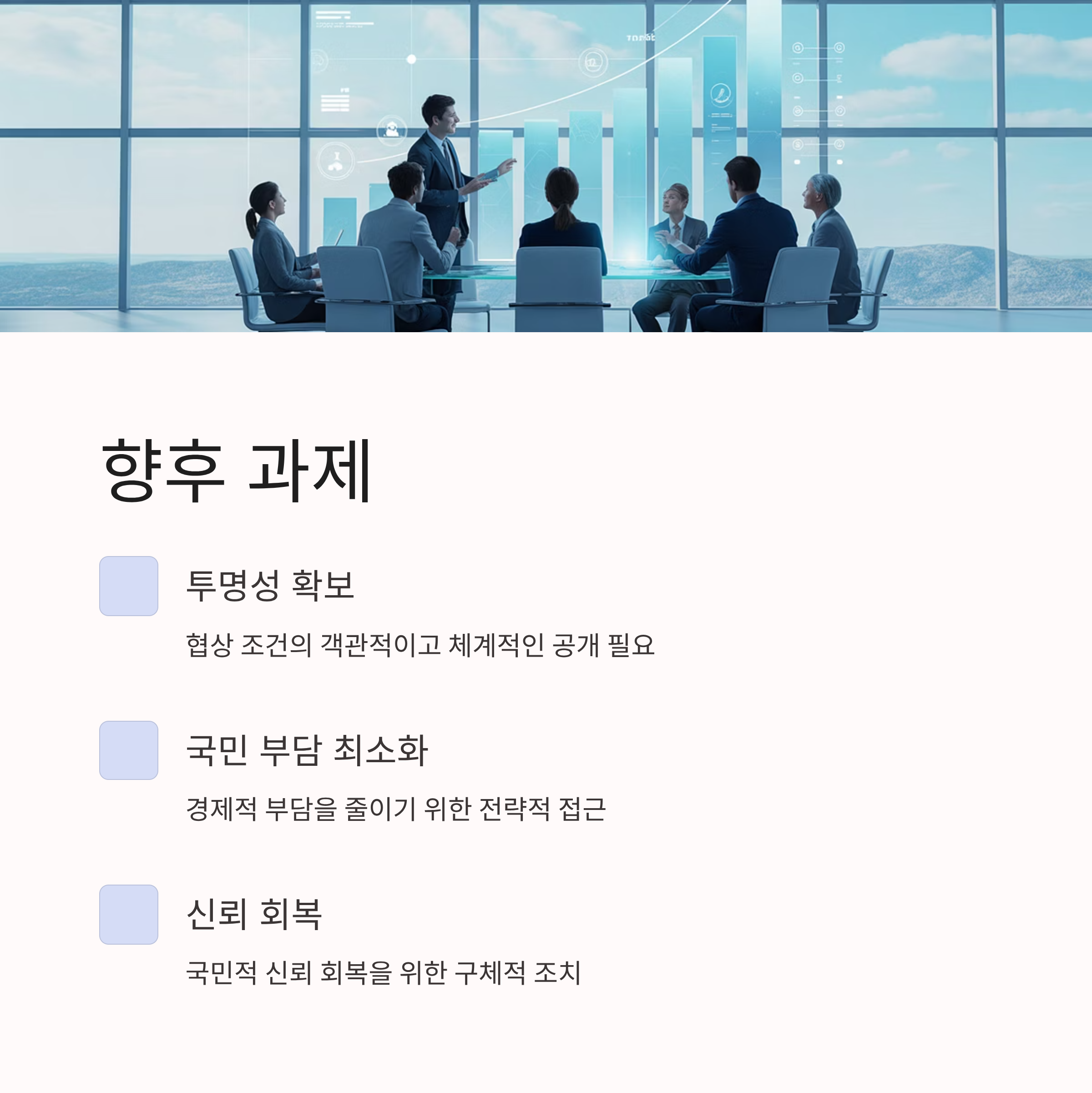 - 최종적으로 국민적 신뢰에 금이 가며, 협상의 방식에 대한 개선 요구가 증가하고 있습니다.