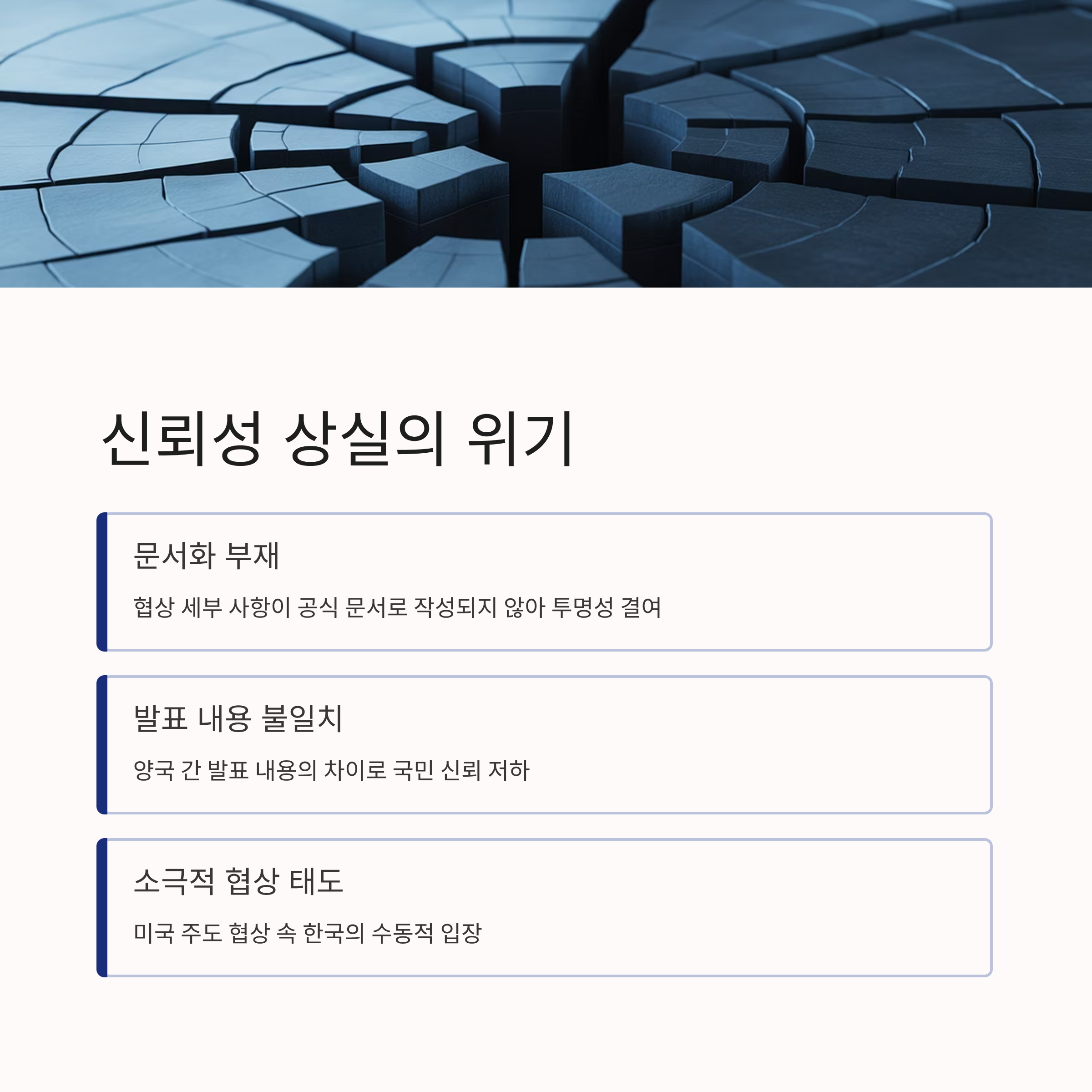 협상이 공개적으로 진행되지 않았다는 점은 신뢰성의 중요한 문제로 부각되었습니다. 양국 간 논의의 세부 사항이 문서화되지 않았고, 발표 내용조차 다른 점에서 국민들은 정부에 대한 신뢰를 잃을 가능성이 큽니다. 특히, 미국이 해당 협상을 주도한 상황 속에서 한국은 상대적으로 소극적인 협상 태도를 취했고, 이로 인해 "굴욕적 외교"라는 비판도 나오고 있습니다. 지난 합의 내용이 명확한 기준 없이 실행된 사례를 떠올린다면, 이번 협상 역시 장기적으로 제대로 이행되지 않을 가능성을 배제하기 어렵습니다. 이는 한국 국민들에게 추가적인 실망 요인이 될 수 있습니다.