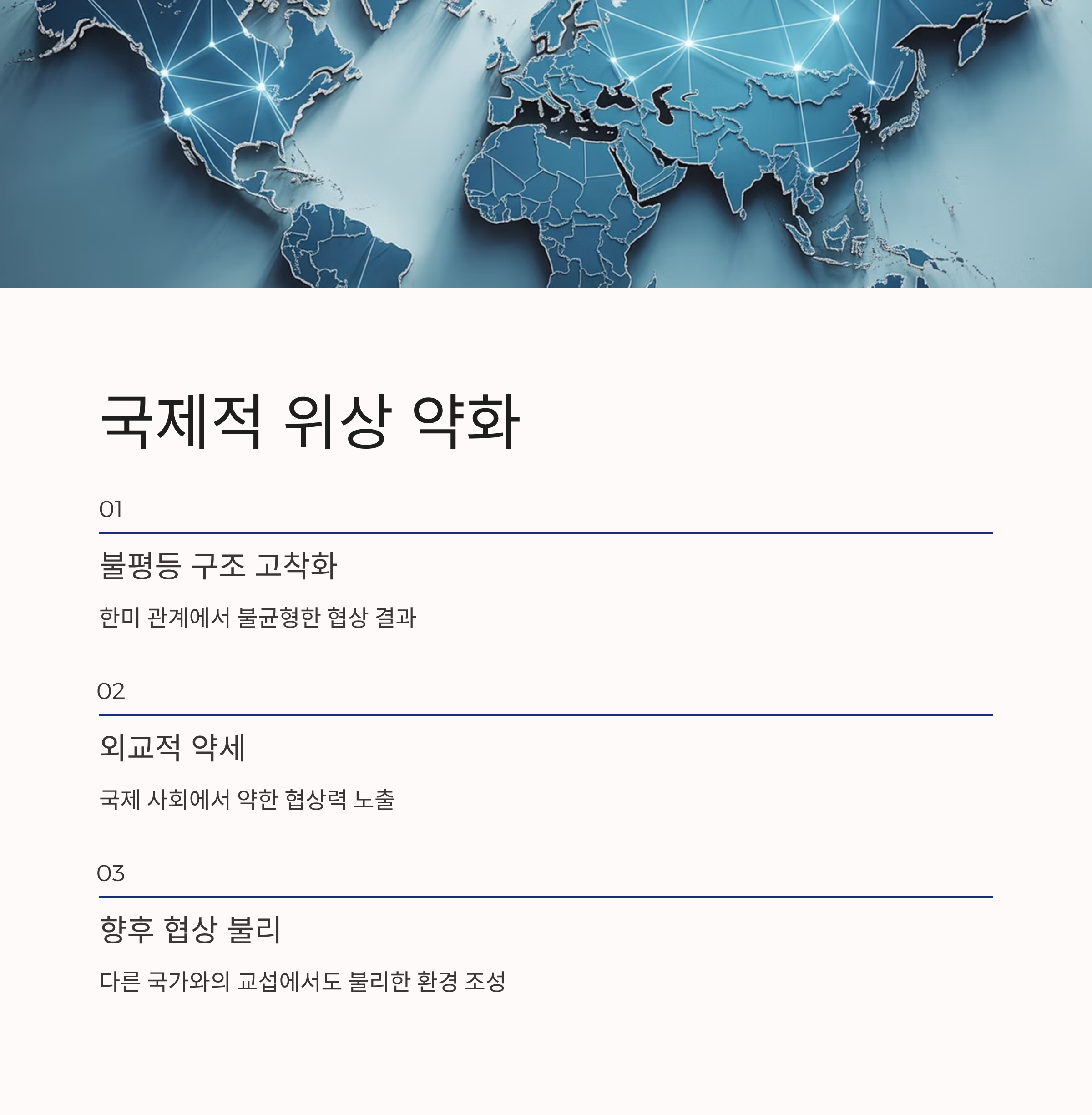 이번 협상은 한미 관계에서 불평등 구조를 고착화할 수 있는 잠재력을 지니고 있습니다. 트럼프 전 대통령의 자화자찬식 성과 발표와는 대조적으로, 한국 측 발표는 구체적 명시가 부족했으며, 이는 외교적으로도 약세로 비칠 수 있는 요인입니다. 나아가, 국제 사회는 특히 경제 무역 협상에서 공정성과 상호주의를 중시하지만, 한국은 협상 과정에서 충분한 국익 보호 전략을 취하지 못했다는 평가가 나옵니다. 이는 다른 국가와의 협상을 진행함에 있어서도 향후 불리한 교섭 환경을 조성할 가능성을 암시합니다.