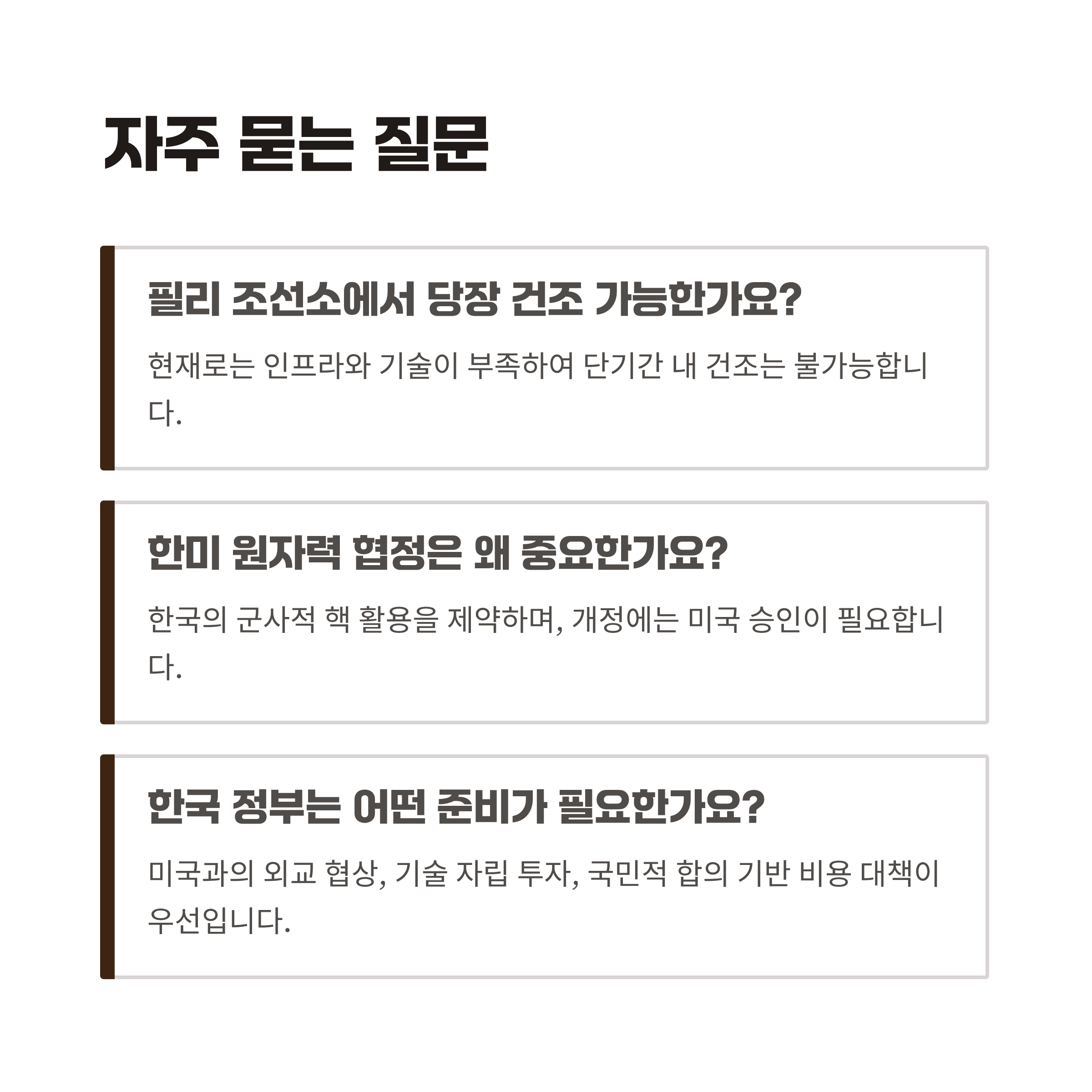 | A. 필리 조선소는 현재로는 핵잠수함 건조를 위한 인프라와 기술이 부족하여, 단기간 내 건조는 불가능합니다. |